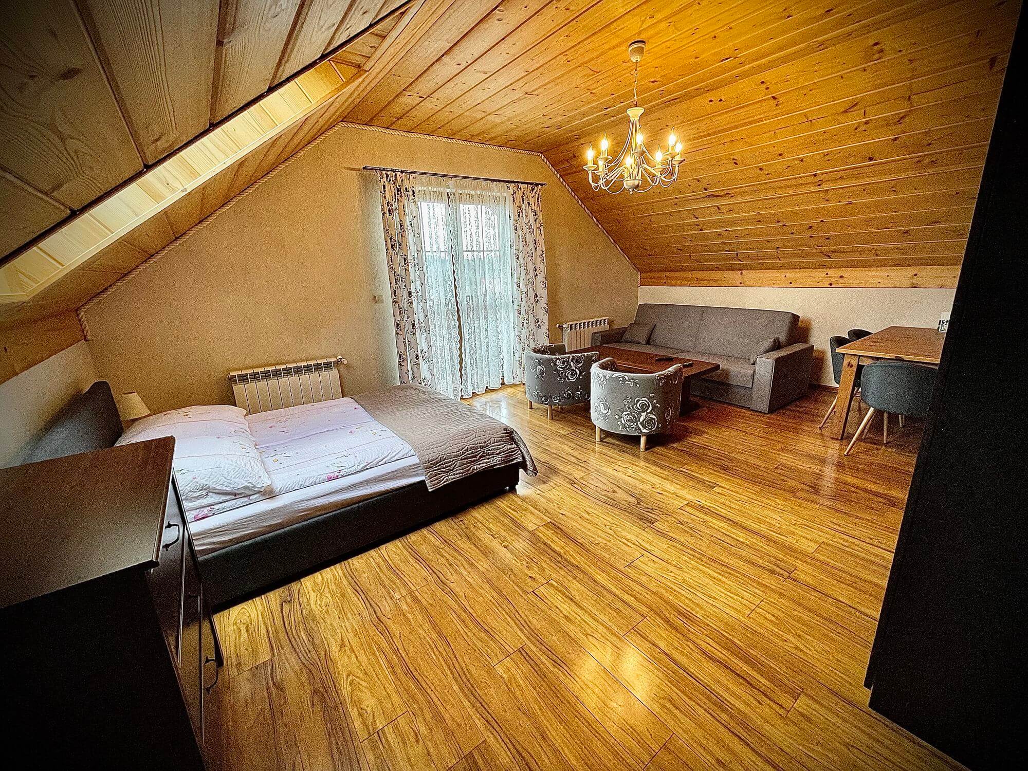 - salon: telewizor, tv sat, wifi, rozkładana kanapa, ława, dwa fotele, komoda z szufladami;