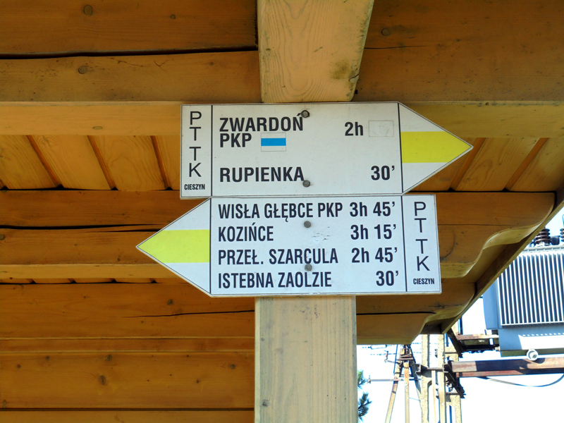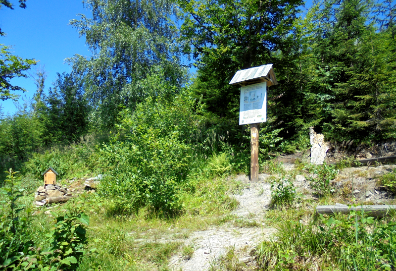 Po niecałych 30 minutach dochodzimy do poprzecznej ścieżki z niebieskim szlakiem turystycznym, prowadzącym z Baraniej Góry – przez Karolówkę i Tyniok – do Zwardonia. Tu szlak spacerowy się kończy (lub zaczyna – zależy od kierunku marszu). Postawiono tu tablicę informującą o źródle Olzy i szlaku spacerowym, pokazując też schematycznie jego przebieg. Przechodzimy na niebieski szlak i kierujemy się za niebieskimi znakami w prawo.
