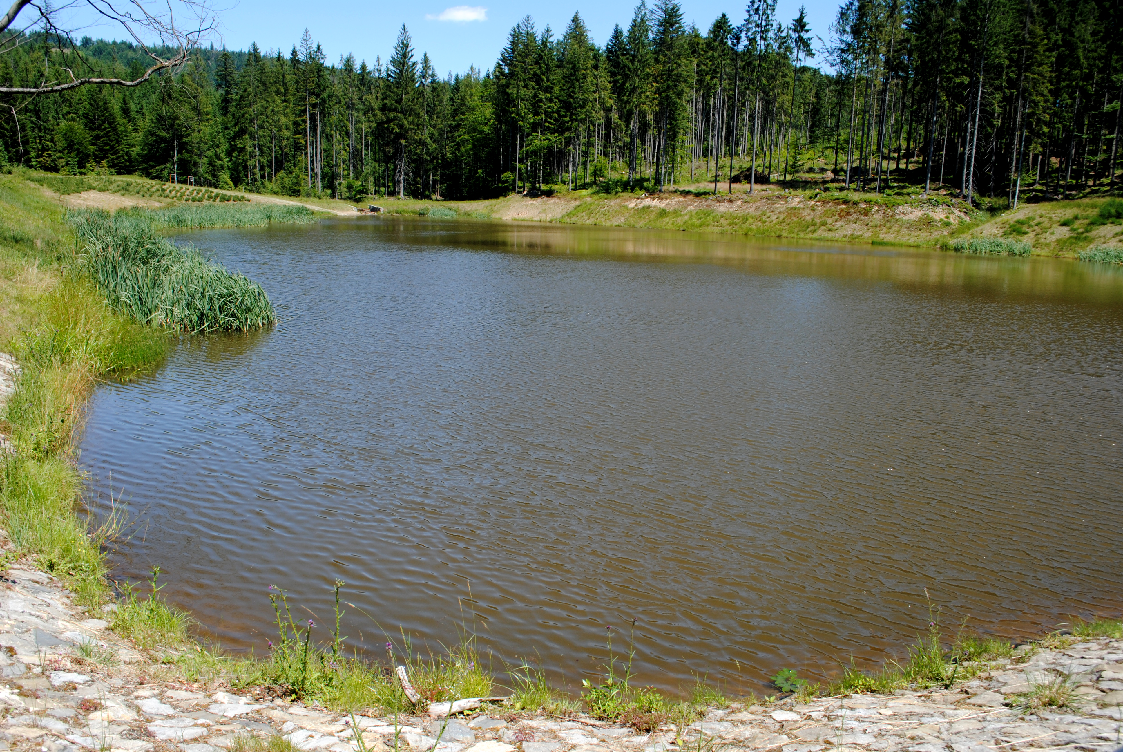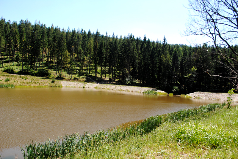Idąc asfaltową drogą za znakami szlaku spacerowego, po 35 minutach dochodzimy do zbiornika retencyjnego na Olzie.