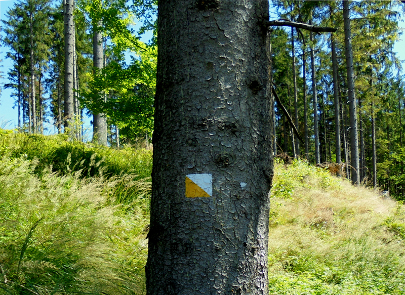 Kontynuując naszą wędrówkę, wracamy sto metrów do drogowskazu i kierujemy się za żółtymi znakami szlaku spacerowego w lewo, trawersując stok Gańczorki. Tu niestety fragment szlaku zasłaniają powalone wiatrem świerki. Możemy je obejść lekkim łukiem, pilnując wyraźnej, oznakowanej ścieżki.