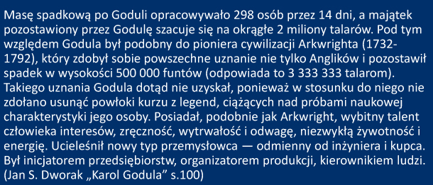 Większość twórców górnośląskiej potęgi przemysłowej XIX wieku rekrutowała się z kręgów arystokracji lub bogatej szlachty. Jedynie osoby Karola Goduli i Franciszka Wincklera nie pasują do tego grona, oni bowiem doszli do bogactwa i zaszczytów własną pracą i umiejętnym obracaniem zarobionym kapitałem.