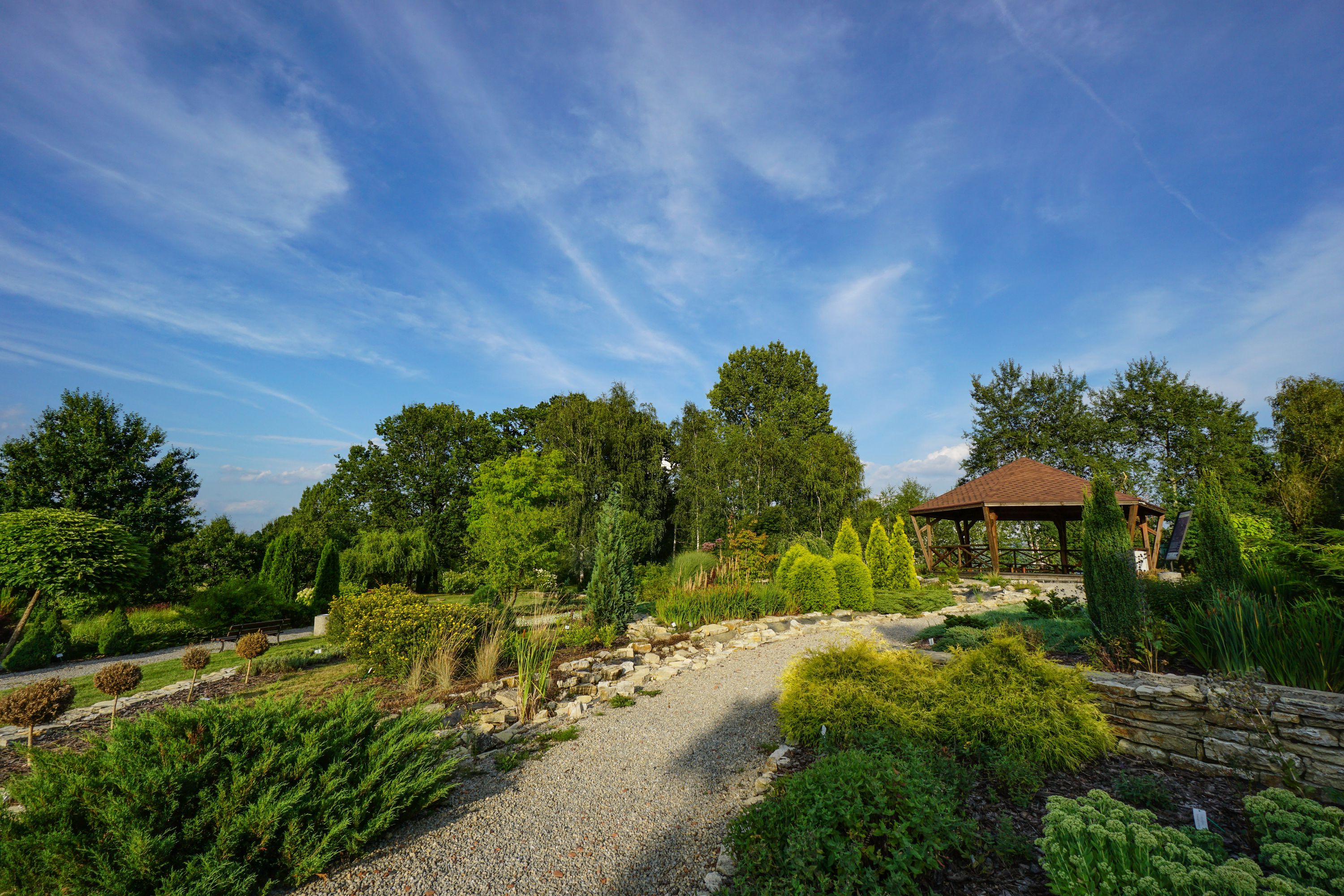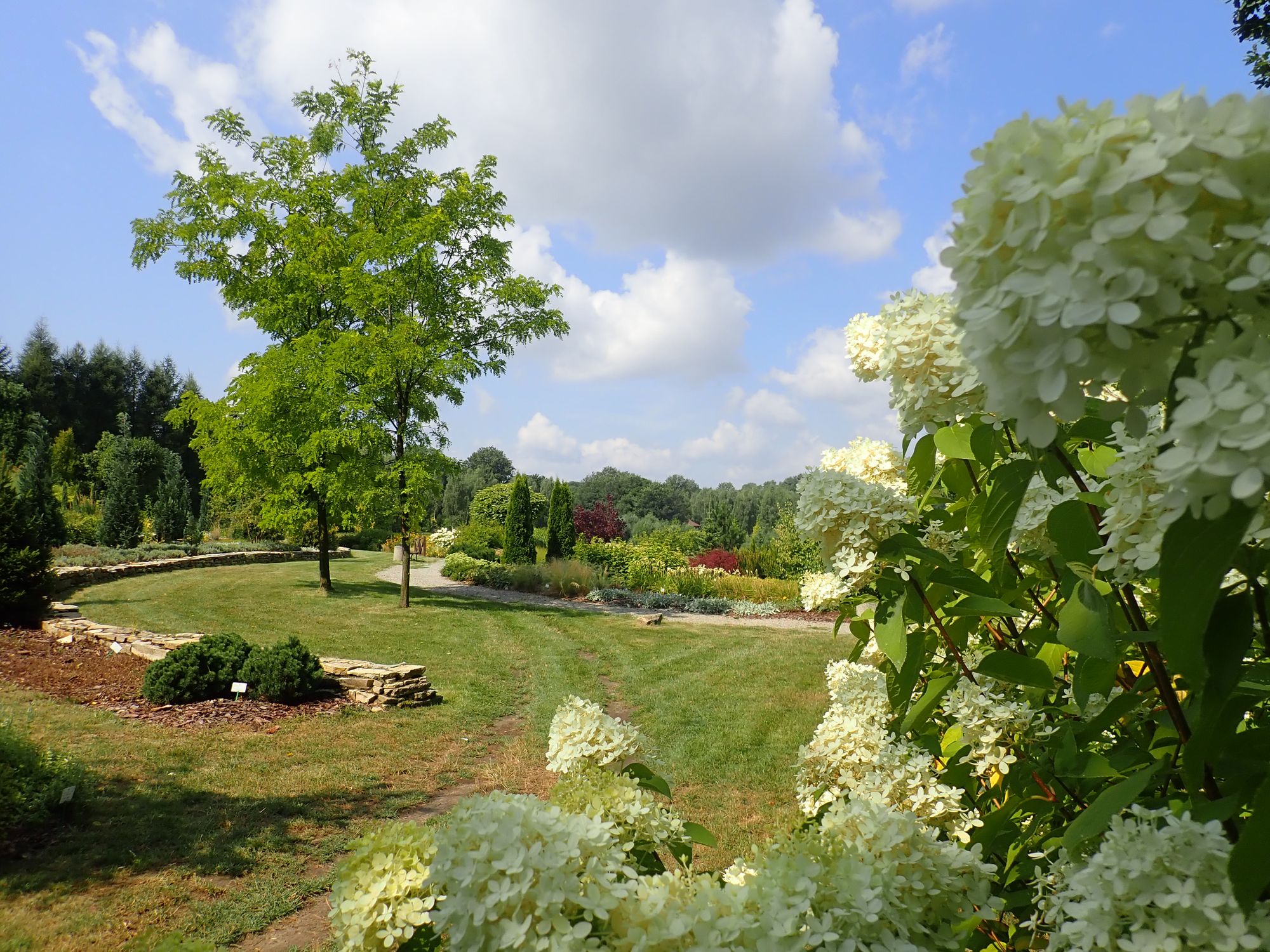 Ogród składa się z dwóch odrębnych przestrzeni połączonych około 2 km ścieżką edukacyjną, poprowadzoną pośród lasów, zakrzewień, łąk i pól uprawnych – terenów niezwykle cennych przyrodniczo i charakteryzujących się bogatą bioróżnorodnością. W jednej z nich – w Ogrodzie Czerwonym – możemy oglądać kolekcje tematyczne: ogród warzywny, winnicę, kolekcję zachowawczą starych odmian jabłoni, łąki: naturalną, kwietną i trzęślicową, ogród kwiatowy i tarasowy, kolekcję rododendronów, refugium oraz kolekcję dendrologiczną. Atrakcją tej części Ogrodu są też ślady dawnej działalności gospodarczej, charakterystycznej dla tego miejsca – piece wapienne (wapienniki) z XIX i XX wieku służące do wypalania wapna ze skał pozyskiwanych z pobliskiego kamieniołomu, na którym obecnie znajduje się platforma widokowa.