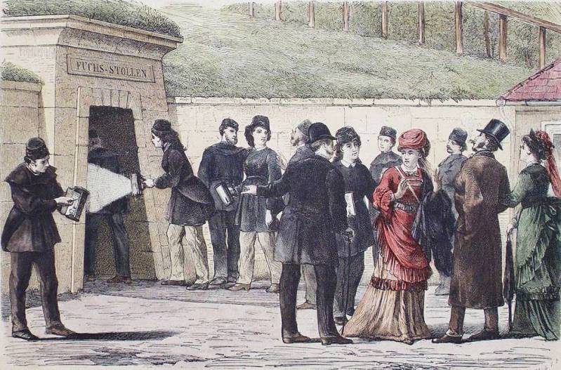 XIX-wieczni turyści przed wejściem do "Lisiej Sztolni" ok. 1876 r., źródło "Das Buch fur Alle"