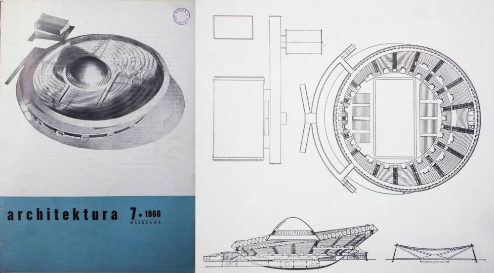 Okładka miesięcznika "Architektura" z wynikami konkursu na halę widowiskowo-sportową i fragment rysunków konkursowych