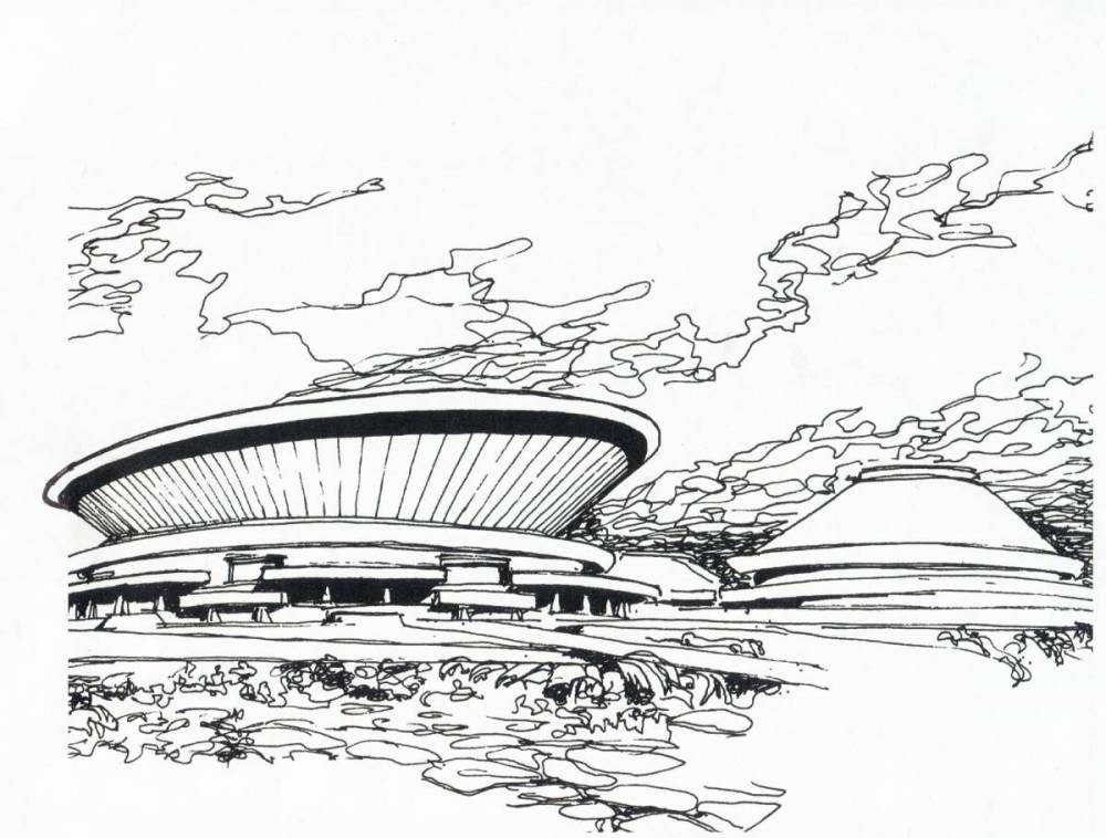 Rysunek architektoniczny "Spodka" i nigdy nie zrealizowanego basenu, źródło: folder WAG