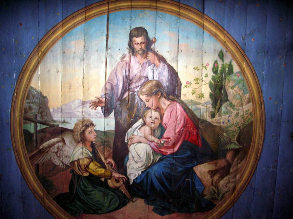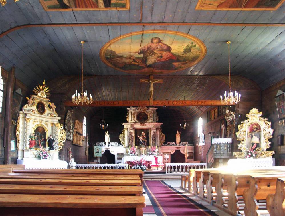Koszęcin, wnętrze kościoła Świętej Trójcy i obraz Świętej Rodziny na stropie, foto Edward Wieczorek