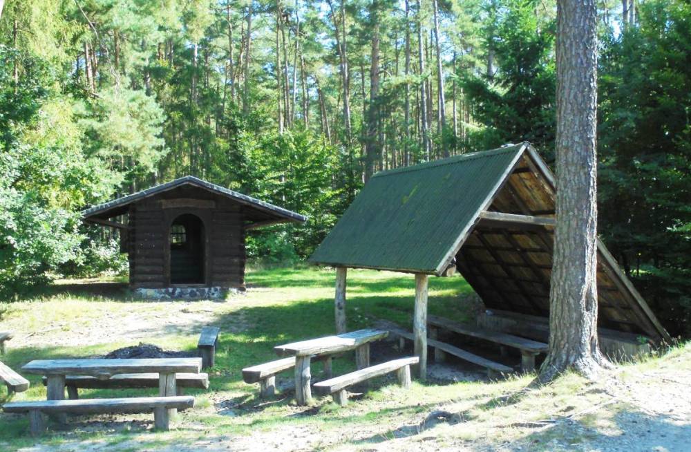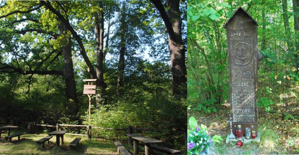 Do 2013 r. stała tu gajówka, rozebrana z powodu dekapitalizacji (koszt remontu przewyższał ponoć jej wartość). Na jej miejscu postawiono kilka ławeczek i stolików, tworząc dla turystów leśne miejsce wypoczynkowe, a w pobliżu – drewnianą kapliczkę św. Huberta. Nasza trasa ponownie przekracza Leśnicę i na rozdrożu – skręca w prawo, do Piłki. Zanim pojawi się zabudowa wsi, mijamy piękny pomnikowy dąb.
