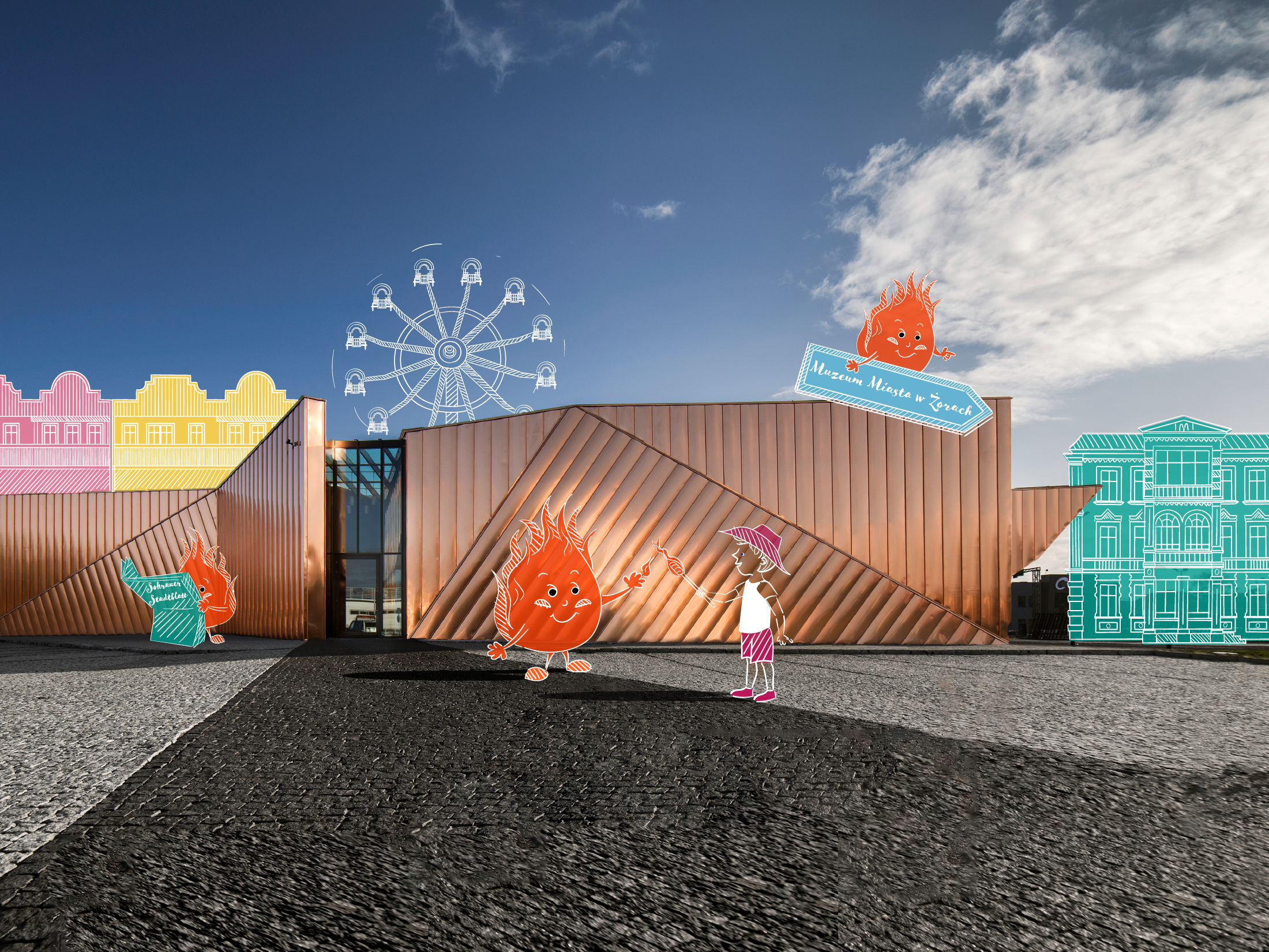 Jeśli nie wiecie, kto wymyślił zapałki, nie macie pojęcia, co jest cieplejsze - nos czy uszy- to muzeum będzie dla Was idealne. Namawiam gorąco, by - zanim wejdziemy do budynku - zwrócić uwagę na jego architekturę. W sumie, w tym konkretnie przypadku, nie powinno być to aż takie trudne bo niewielki pawilon Muzeum Ognia rzeczywiście odstaje od reszty otoczenia i zadziwia swoją formą. Pokryty miedzianą blachą budynek zaprojektowali Barbara i Oskar Grąbczewscy, którzy wyobrazili go sobie jako pełzający ogień. Jeśli dobrze popatrzeć, obiekt rzeczywiście odzwierciedla ruch, dynamikę i zmienność ognia. Taka zabawa w rozmowę o architekturze może być naprawdę wciągająca. Wystarczy zadać pytanie: „z czym kojarzysz kształt tego muzeum ?” a odpowiedzi i to, co podpowiada wyobraźnia najmłodszych uczestników wycieczki, mogą nas zadziwić.