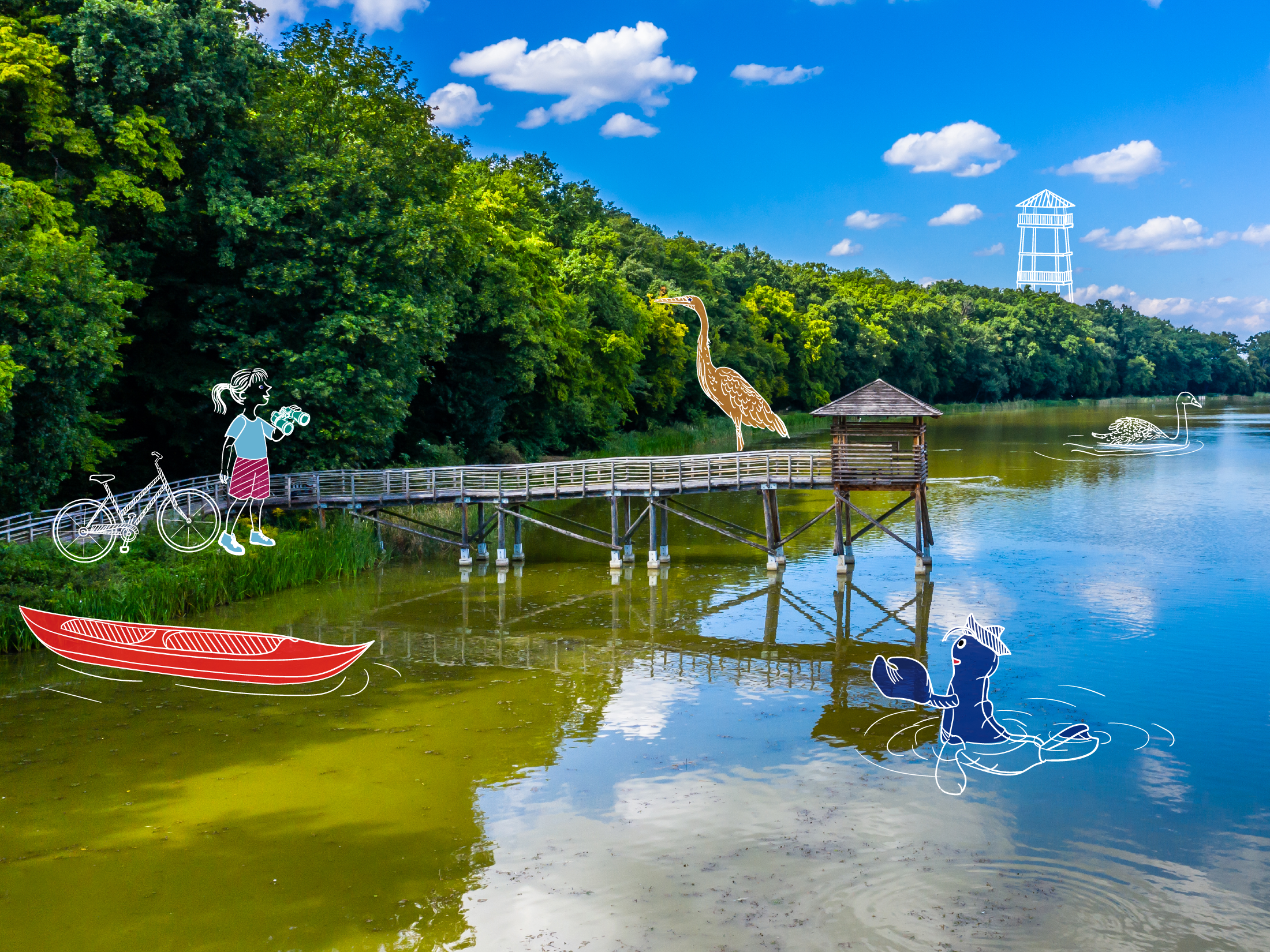 A taki Rezerwat Łężczok? Toż to raj dla miłośników ptaków! Właściwie to taki ptasi rezerwat, a ptaki możemy podglądać z dwóch platform widokowych. Jedna z nich jest na wodzie. Wejście na platformę po drabinie to fajna atrakcja dla większych dzieci, z mniejszymi podjedziemy wózkiem po pomoście prowadzącym do platformy. Raczek przypomina nam, że do rezerwatu nie można wziąć ze sobą zwierząt, nie wolno też rozpalać ognisk, łowić ryb, no i obowiązuje tam zakaz wjazdu dla samochodów.