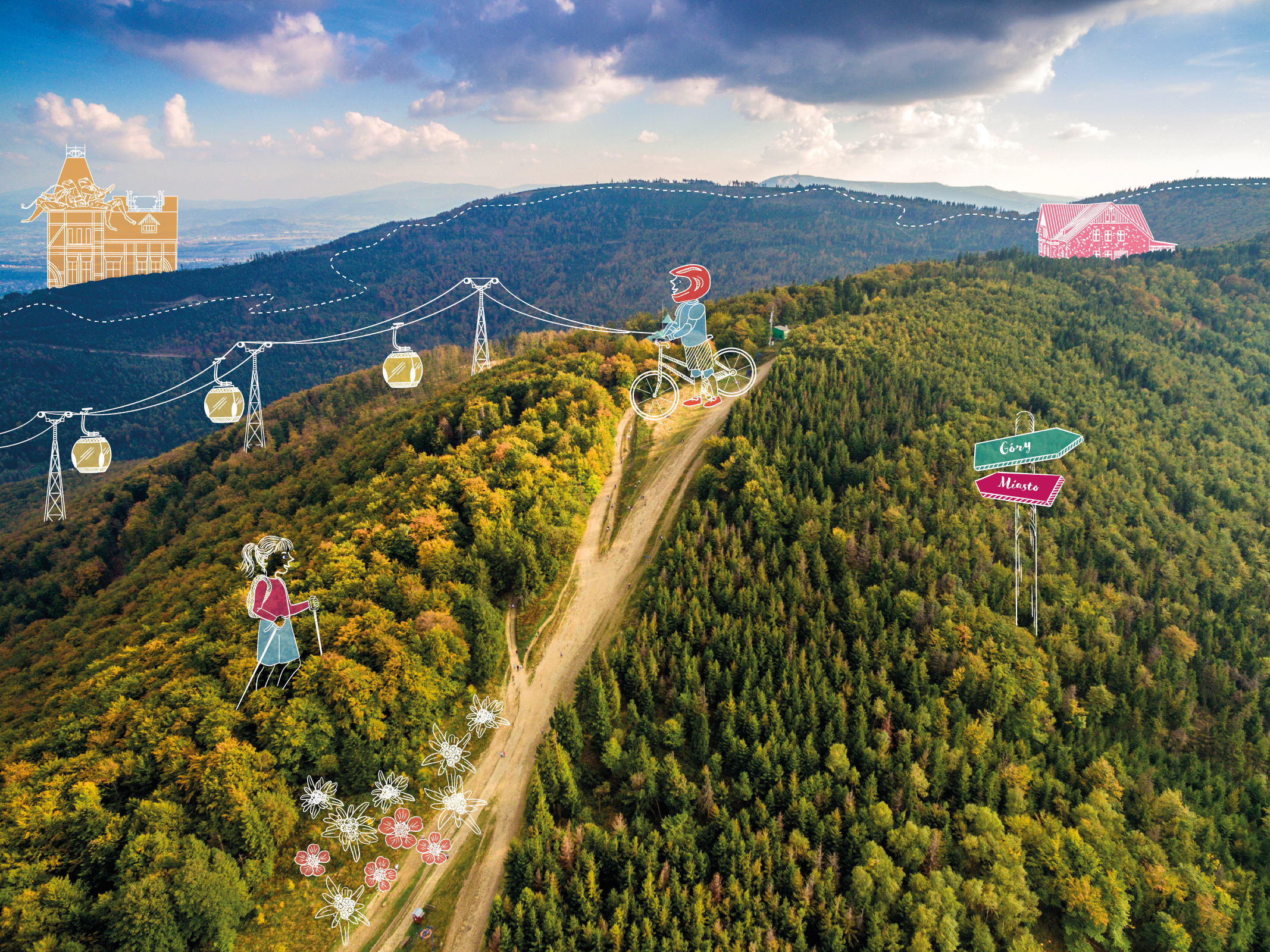 Dzisiaj kolejką wwożeni są nie tylko spacerowicze i narciarze. Na szczyt Szyndzielni wjechać można też z rowerami, bo właśnie tam rozpoczynają się kolejne trasy dla naszych jednośladów. Gdy gondolka niespiesznie wjeżdża na szczyt, my możemy fotografować roztaczającą się z trasy panoramę Bielska.