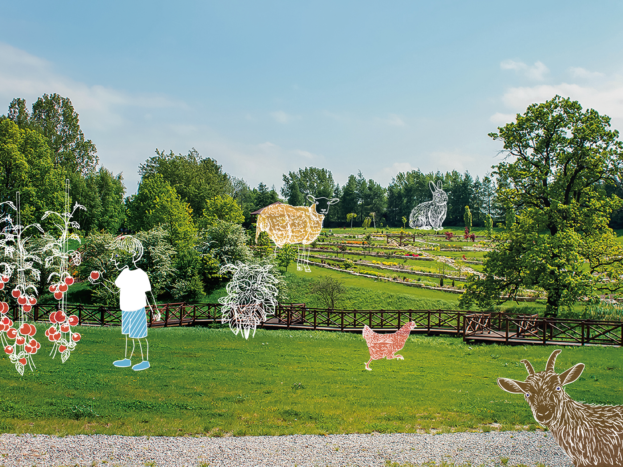 Całkowita powierzchnia gospodarstwa to ponad sześć tysięcy metrów kwadratowych, które zagospodarowano w perfekcyjny sposób. Oprócz stref przeznaczonych do zabawy (jak karaibska plaża przy głównej drodze w Mikołowie) są też edukacyjne, w których najmłodsi zobaczą, jak wygląda mięta, sprawdzą, gdzie rosną pomidory i pogłaskają kucyka.