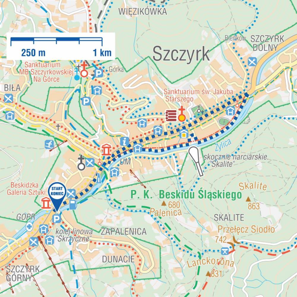 Spacer rozpoczyna się przy Urzędzie Miasta i biegnie wzdłuż rzeki Żylicy do Pl. św. Jakuba i dalej do amfiteatru „Skalite”, obok skoczni „Skalite” oraz Centralnego Ośrodka Sportu i wychodzi do ul. Beskidzkiej. Jeżeli wrócimy tą samą trasą to łącznie trasa wyniesie 4 km. Możemy wrócić ul. Beskidzką, na trasie zwiedzając drewniany kościółek pw. św. Jakuba (3,8 km).