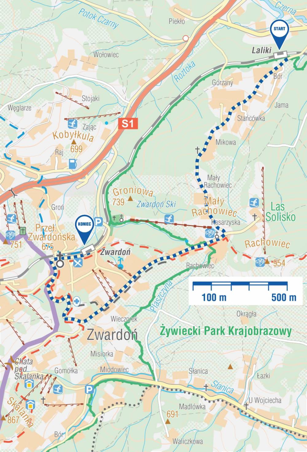 Wędrówkę rozpoczynamy od maleńkiej stacji kolejowej PKP Laliki. Tu możemy dojechać PKP lub SAM. Bus do 7,5 t może podjechać do stacji, większe muszą wysadzić grupę przy drodze Sól – Laliki (+400 m). Od stacji PKP Laliki idziemy wąską, asfaltową drogą pod górę, aż do stacji KOLEJKI KRZESEŁKOWEJ MAŁY RACHOWIEC. Z tego miejsca rozciąga się piękna panorama. Po minięciu kolejki droga się obniża i po chwili rozgałęzia. My skręcamy w prawo i dalej wędrujemy wąską, asfaltową drogą do stacji PKP w Zwardoniu. Tu może podjechać po nas BUS albo pociągiem dotrzemy do stacji Laliki lub innej docelowej.