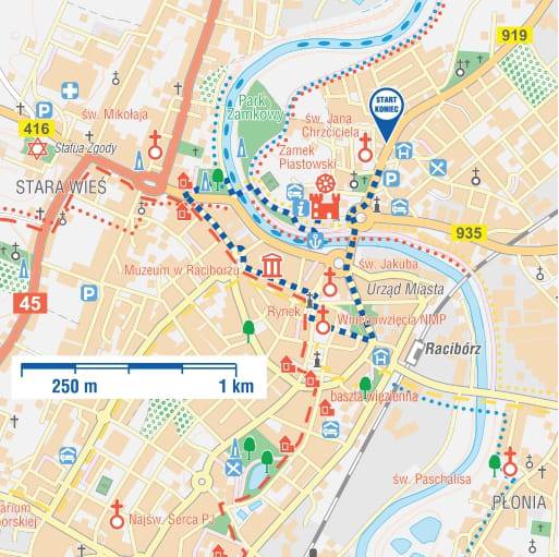 Parking dla SAM/BUS przy DW 919 między ul. Armii Krajowej, a ul. Karola. SAM można też zaparkować przy ul. Zamkowej. Wędrówkę rozpoczynamy od ul. Zamkowej, od zwiedzenia ZAMKU PIASTOWSKIEGO. Od ul. Zamkowej wchodzimy przez zabytkową bramę wjazdową z I poł. XVII wieku. W budynku bramnym mieści się Punkt Informacji Turystycznej. PIT wyposażony jest ponadto w 30 audio przewodników z wycieczkami po mieście Racibórz w dwóch wersjach: dla dzieci i dorosłych, w polskiej i niemieckiej wersji językowej. Wchodzimy na dziedziniec zamkowy. Na środku dziedzińca znajduje się zadaszona studnia. Po prawej kolejno: KAPLICA ZAMKOWA, DOM KSIĄŻĘCY oraz BROWAR ZAMKOWY, istniejący od XVI stulecia. Odrestaurowany zamek z XIII w. i kaplica są udostępnione dla zwiedzających. Gotycka kaplica św. Tomasza Becketa z Canterbury nazywana jest perłą górnośląskiego gotyku. W Domu Książęcym można zwiedzić wystawy: przyrodniczą, związaną z więziennictwem czy z makietami pałaców Ziemi Raciborskiej. Kaplica i wystawy są udostępnione dla wózkowiczów. Na zewnątrz jest platforma (podnośnik), a wewnątrz budynku winda. Wychodzimy z zamku i skręcamy w prawo.