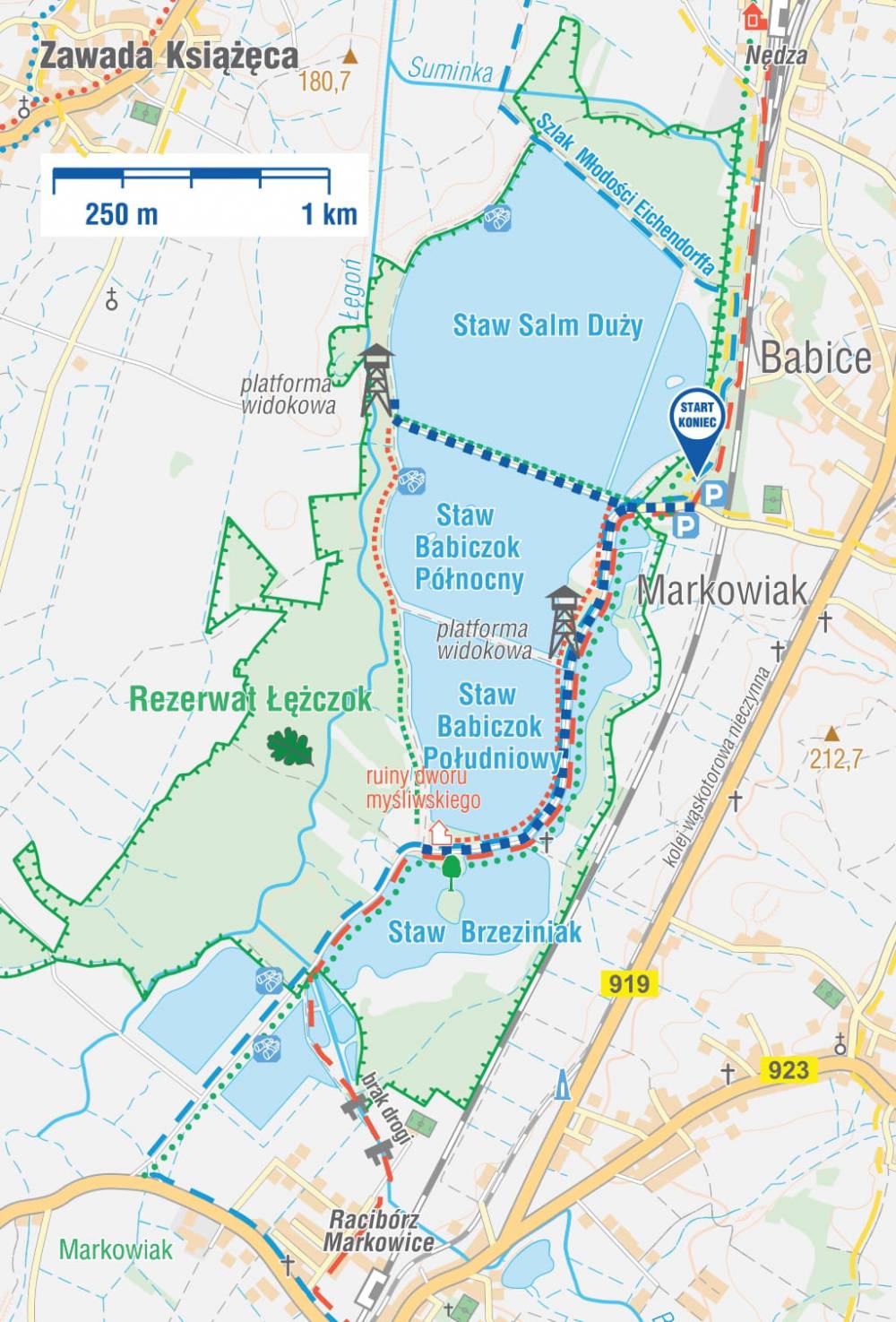 Od parkingu skręcamy w lewo i przy rozgałęzieniu dróg wybieramy drogę w prawo, gdzie czerwonym szlakiem spacerowym wchodzimy na groblę. Szlakiem tym dochodzimy do DREWNIANEJ PLATFORMY WIDOKOWEJ NA STAWIE SALM DUŻY. Platformę zaopatrzono w podjazd, udostępniając ją dla osób z niepełnosprawnością ruchową. Wracamy tą samą drogą do rozgałęzienia dróg. Do tego momentu długość trasy wyniosła ok. 2 km. Skręcamy w prawo. Wędrujemy czerwonym szlakiem, mając po prawej STAW BABICZAK POŁUDNIOWY. Po przejściu 1,8 km dochodzimy do pomnika przyrody – Dębu Sobieskiego i do dawnego Dworku Myśliwskiego. Powrót tą samą trasą.