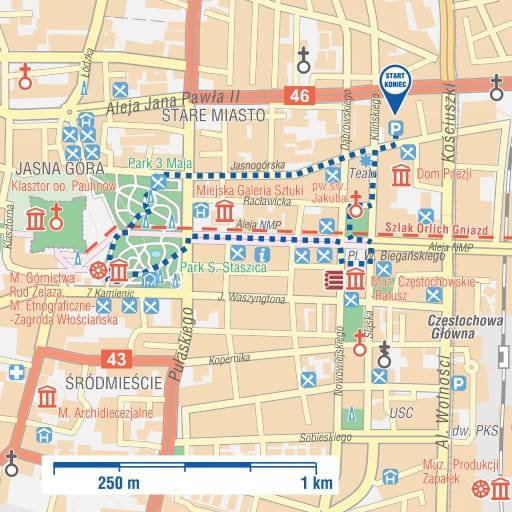 Wchodzimy na PL. WŁADYSŁAWA BIEGAŃSKIEGO. Po prawej RATUSZ, w budynku ulokowano ekspozycję poświęconą dziejom Częstochowy, a także wystawę obrazów i fotografii współczesnych artystów. Budynek jest 3-poziomowy, dostosowany do potrzeb osób z niepełnosprawnością ruchową, z wyłączeniem wieży widokowej. Toalety dla osób niepełnosprawnych znajdują się na kondygnacjach 0 i 1. Przed Ratuszem pomnik J. Piłsudskiego. Po przeciwnej stronie KOŚCIÓŁ PW. ŚW. JAKUBA, posiadający cechy architektury neobizantyjskiej. Wejście do kościoła po schodach, bez podjazdów. Za kościołem pw. św. Jakuba idziemy ul. J. Kilińskiego, po przejściu 400 m dochodzimy do ul. Jasnogórskiej. Przy skrzyżowaniu po lewej budynek Teatru im. A. Mickiewicza (wzniesiony w latach 1927-1931). My jednak skręcamy w prawo i po 140 m po prawej widzimy tablicę z napisem Dom Poezji. Skręcamy w wąską uliczkę i wchodzimy do MUZEUM HALINY POŚWIATOWSKIEJ. To obiekt parterowy z możliwością bezpośredniego wjazdu z zewnątrz. Wracamy ul. Jasnogórską do RenkTeatru i dalej jeszcze 800 m do ul. 3 Maja, gdzie za kortami, wchodzimy do Parku 3 Maja. Przechodzimy obok pomnika S. Moniuszki, wychodzimy na Al. H. Sienkiewicza. Stąd piękny widok na Jasną Górę, skręcamy w prawo i pierwszą ulicę w lewo – pasaż Stefana Bareły. Przy niej parking, z którego rozpoczęliśmy wędrówkę.