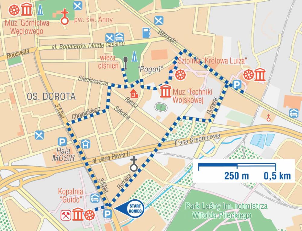 SAM/BUS parkujemy przy KOPALNI GUIDO, przy ul. 3 Maja 93. Z parkingu idziemy w kierunku niebieskiej wieży szybu „Kolejowy”. Obok wieży szybowej budynek nadszybia z przeszkloną fasadą, w którym mieszczą się kasy, sklepik oraz dostępne dla wózkowiczów WC. Zwiedzanie podziemi na poziomie 320 m, tylko częściowo dostępne dla osób na wózkach. Zwiedzanie całej trasy trwa ok. 2,5 h, a jej długość wynosi ok. 3 km. Zwiedzanie podziemi na poziomie 170 m trwa ok. 1 h i jest w pełni dostępne dla osób na wózkach. Trasa ma długość ok. 1 km, koncentruje się na trudzie pracy w kopalni z początku XX w. Głównym elementem trasy jest utworzona w jednej z kopalnianych komór kaplica św. Barbary. Po zwiedzeniu Kopalni Guido przechodzimy ul. Rymera i Wolności (trasa 1,5 km) do STREFY CARNALL SZTOLNI KRÓLOWA LUIZA. Możemy też odcinek ten przejechać SAM/BUS (Parking przy ul. Wolności 408 obok Łaźni Łańcuszkowej Strefy Carnall). Strefa Carnall – nazwana tak od charakterystycznego szybu górującego nad całością, będącego częścią historycznej Kopalni Królowa Luiza – to zespół zabytkowych, powierzchniowych zabudowań kopalnianych z przełomu XIX i XX w., należących do kompleksu Sztolni Królowa Luiza w Zabrzu. Poprzemysłowe budynki możemy zwiedzać sami, ale zdecydowanie lepiej skorzystać z przewodnika. Wejście do Łaźni od strony parkingu, po pochylni.