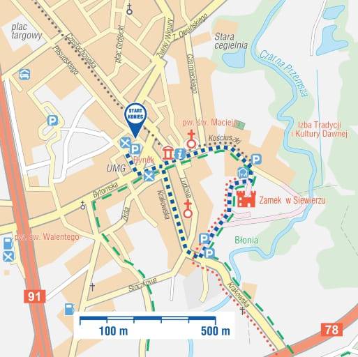 Z zamku idziemy zielonym szlakiem do ul. Kościuszki, dochodzimy do Bramy Biskupiej prowadzącej na teren kościoła pw. św. Macieja. Wejście do kościoła po pokonaniu dwóch ok. 5 cm progów. Kolejnym budynkiem przy ul. Kościuszki jest siedziba Punktu Informacji Turystycznej i Izby Tradycji i Kultury. Jest to budynek starej gminy, późnoklasycystyczny, z przełomu XVIII i XIX w. Dach mansardowy, kryty gontem. Dla wózkowiczów ekspozycje dostępne na parterze, wjazd z poziomu 0. Dwie salki na poddaszu osiągalne po pokonaniu schodów. Brak windy. Idąc dalej ul. Kościuszki dochodzimy do naroża rynku. Na płycie rynku uwagę przykuwa ciekawa fontanna z rzeźbą siewierskich panien. Powstała ona w 2009 r. jako nawiązanie do piosenki „Od Siewierza jechał wóz, malowane panny wiózł”, którą w swym repertuarze ma Zespół Pieśni i Tańca „Śląsk”. W 2018 r. obok fontanny stanęła Ławeczka Hadyny i Pyzika – autorów tej piosenki. Z rynku wychodzimy ul. Krakowską i dochodzimy po 500 m do parkingu – miejscu startu.
