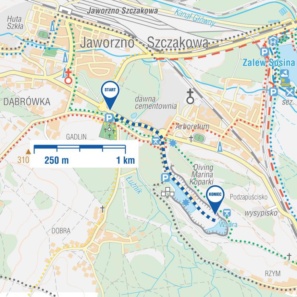 SAM/BUS parkujemy przy ul. Jaworowej na parkingu przy cmentarzu komunalnym. Wychodzimy na ul. Jaworową, skręcamy w lewo, dochodzimy do ul. Sobieskiego, skręcamy w prawo i chodnikiem wędrujemy do ronda. To odcinek o długości 600 m. Z ronda wchodzimy w ul. Płetwonurków i nią dochodzimy do Zbiornika Koparki. Tu, w nieczynnym już kamieniołomie dolomitu Gródek zalanym wodą, powstało popularne centrum nurkowe Diving Marina Koparki. To jedno z najpopularniejszych polskich miejsc do nurkowania. Znajduje się tu całoroczna baza nurkowa „Koparki”.