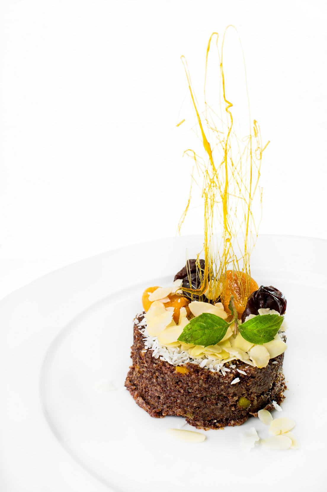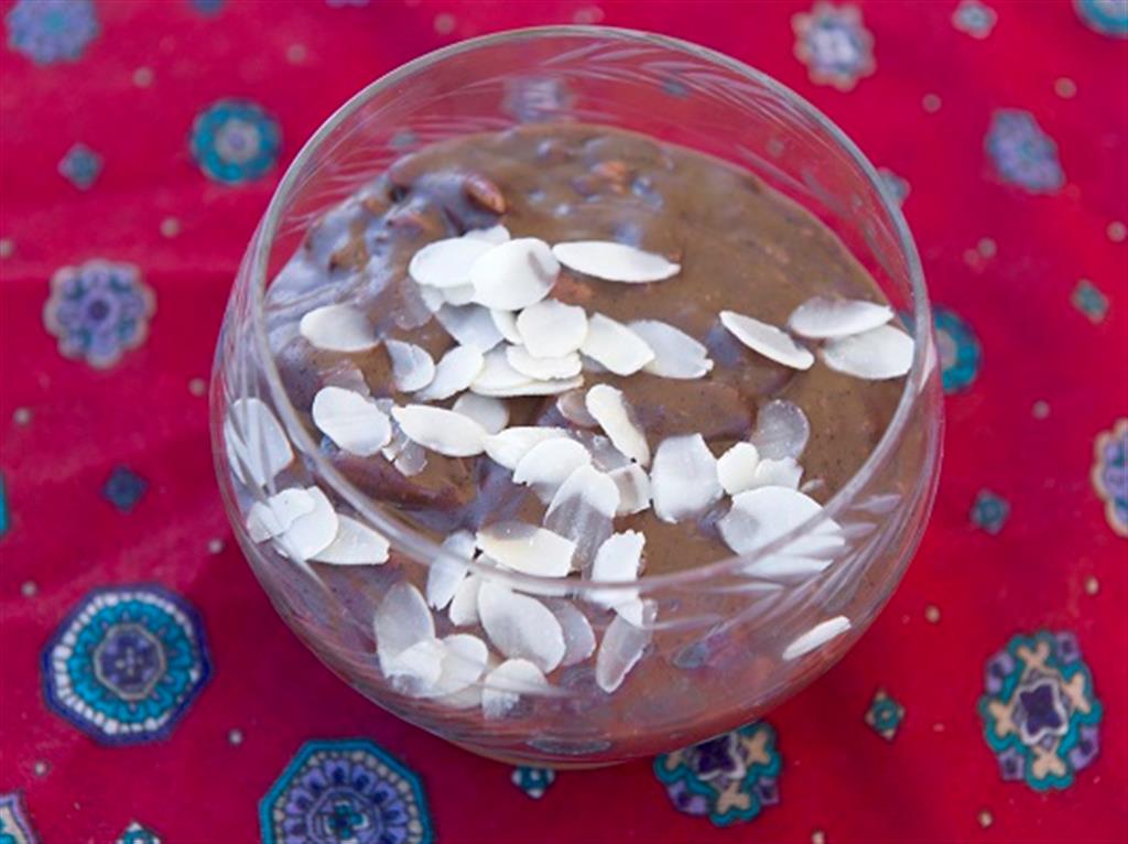Gotować syrop cukrowy przez pół godziny. Piernik moczyć w 1l wody, dodać kakao i sól, zblendować do gładkiej masy. Dodać do gotującego się syropu. Masło zrumienić i dodać do wywaru. Kompoty wraz z owocami zmiksować na gładką masę, dodać do gotującej się mieszaniny. Zagotować. Zagęścić zawiesiną wody z mąką. Zagotować. Dodać posiekane orzechy, migdały i namoczone wcześniej rodzynki. Całość gotować kilka minut z wcześniej sparzoną cytryną. Po wyjęciu cytryny wsypać kawę, zagotować. Ostudzić. Wyporcjować.