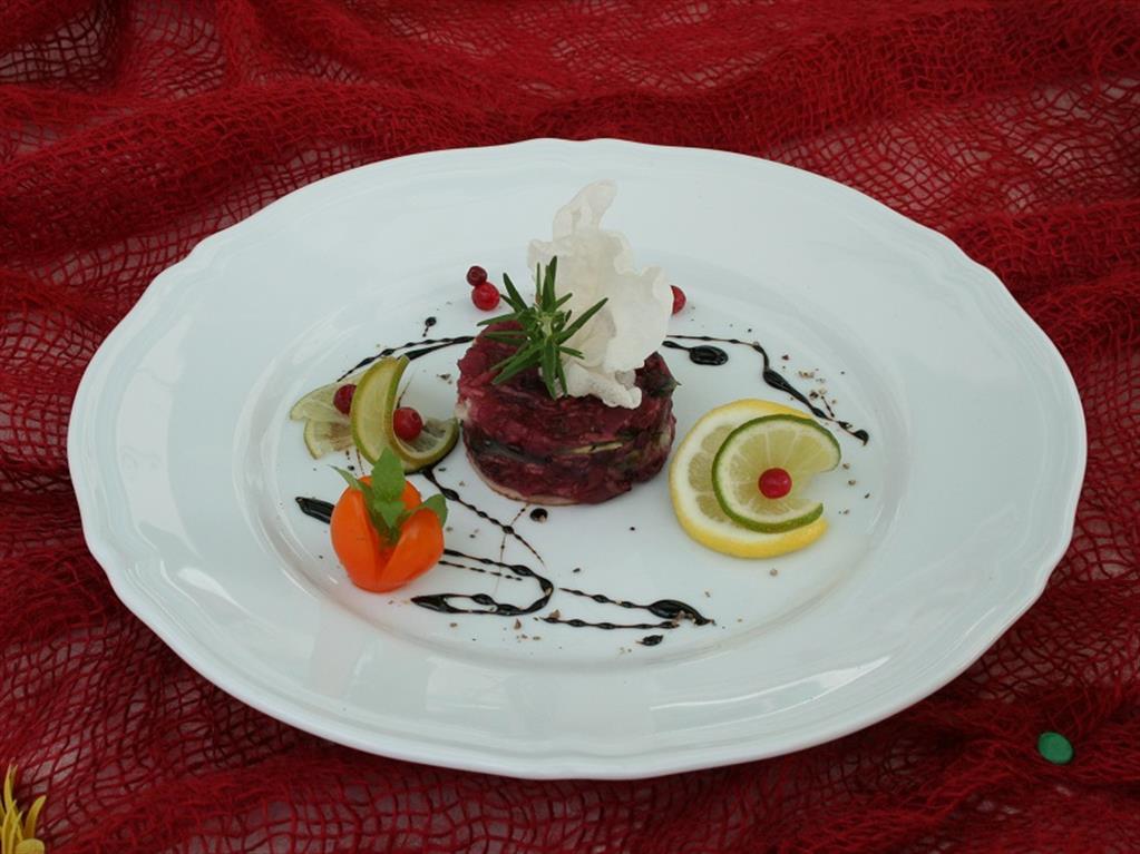 Karpia oczyszczamy z ości. Następnie przyprawiamy go i smażymy na patelni lub w piecu konwekcyjnym. Zostawiamy do wystygnięcia i następnie kroimy w drobne cząstki. Żurawinę łączymy z wiśniami oraz z obranym jabłkiem. Ocet balsamiczny łączymy z miodem. Całość przekładamy warstwowo (karp – żurawina, karp – żurawina) i polewamy sosem.