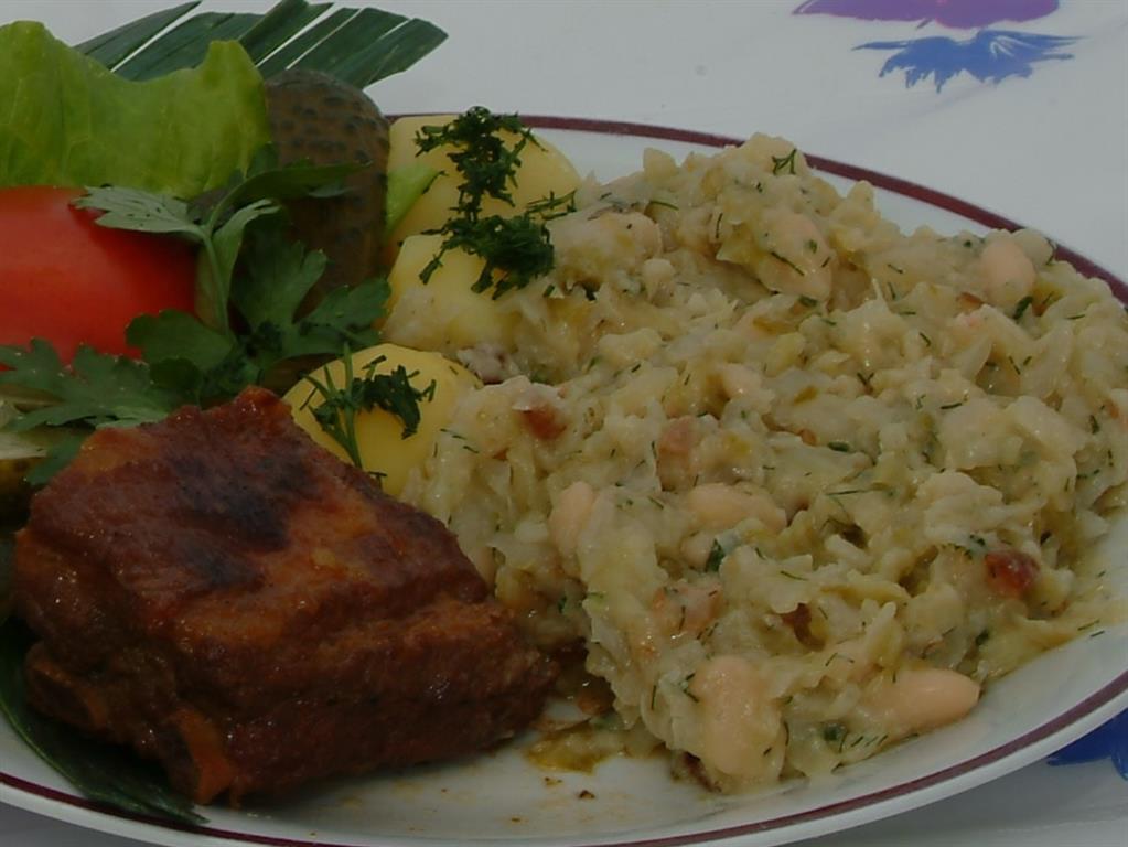 Kapustę pokroić, włożyć do garnka z wodą, gotować aż zrobi się miękka. Po ugotowaniu kapustę odcedzić, posolić, dodać kostkę bulionu i wlać 1 łyżkę octu. Wszystko wymieszać, przykryć pokrywką. Następnie pokroić słoninę w kostkę, stopić ją. Do stopionej słoniny dodać cebulę drobno posiekaną, zrumienić ją na złoty kolor, dodać 1 ½ łyżki mąki, siekaną pietruszkę i koperek. Wszystko zasmażać na złoty kolor i dolać wody, po czym zagotować na patelni. Przelać zasmażkę z patelni do garnka z kapustą, wymieszać. Ugotować fasolę, ugnieść, włożyć do garnka z kapustą, wymieszać i zostawić pod przykryciem na 15 minut.