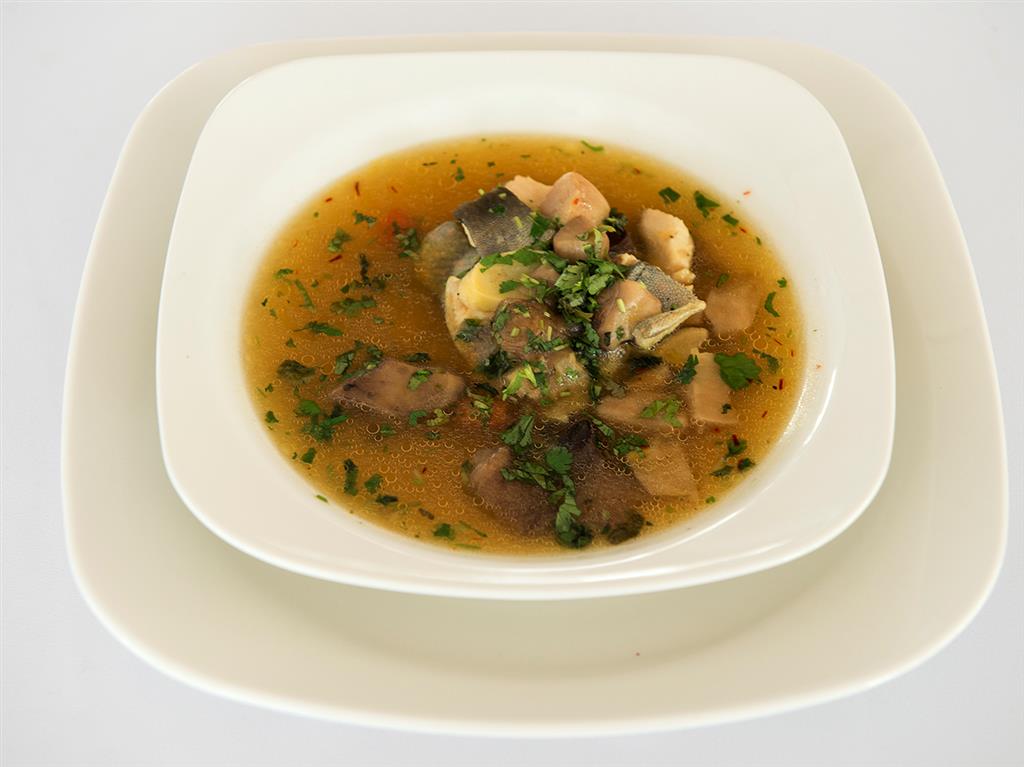 Pstrągi filetować i odstawić w chłodne miejsce. Na bazie pozostałości z pstrąga należy gotować intensywny wywar z dodatkiem włoszczyzny. W międzyczasie namoczyć suszone grzyby i je obgotować. Łączyć wywar grzybowy, rybny i dodać do tego pokrojoną włoszczyznę oraz grzyby. Doprawić solą i pieprzem, gotować to wszystko razem dodając liść laurowy, ziele angielskie, świeżą kolendrę. Na koniec dodać filety z pstrąga tylko do zaparzenia.
