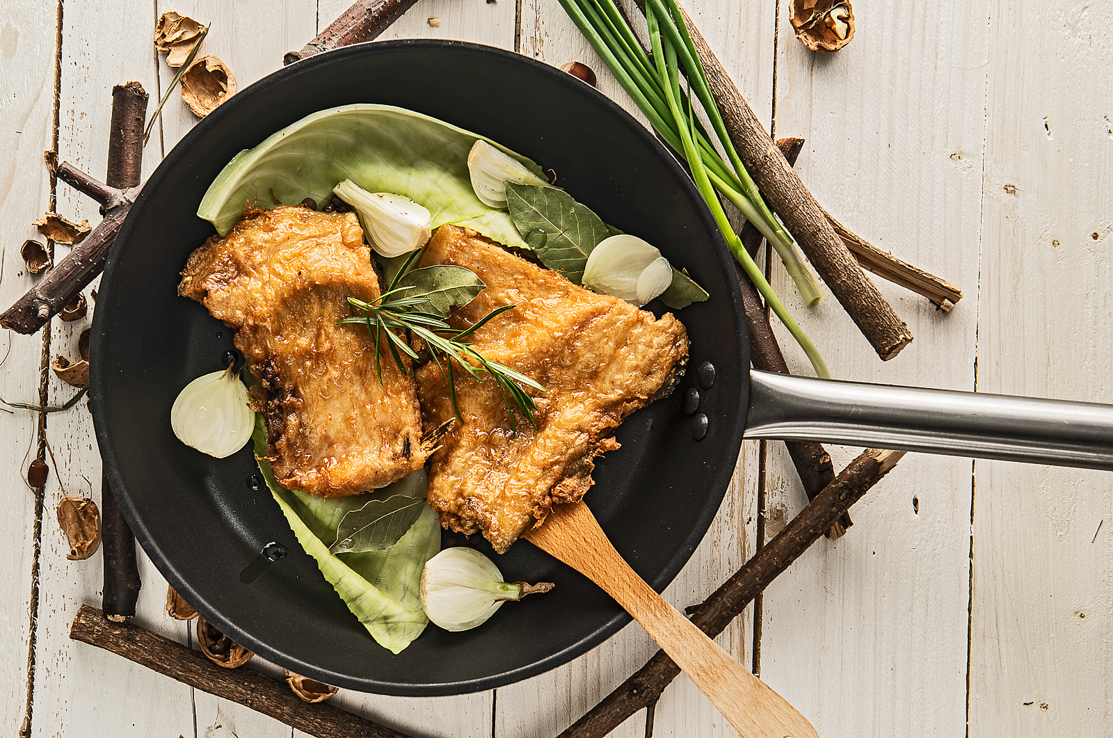 - Na patelni rozgrzej masło, podsmaż cebulę, a następnie dodaj karpia i smaż z obu stron przez kilka minut.