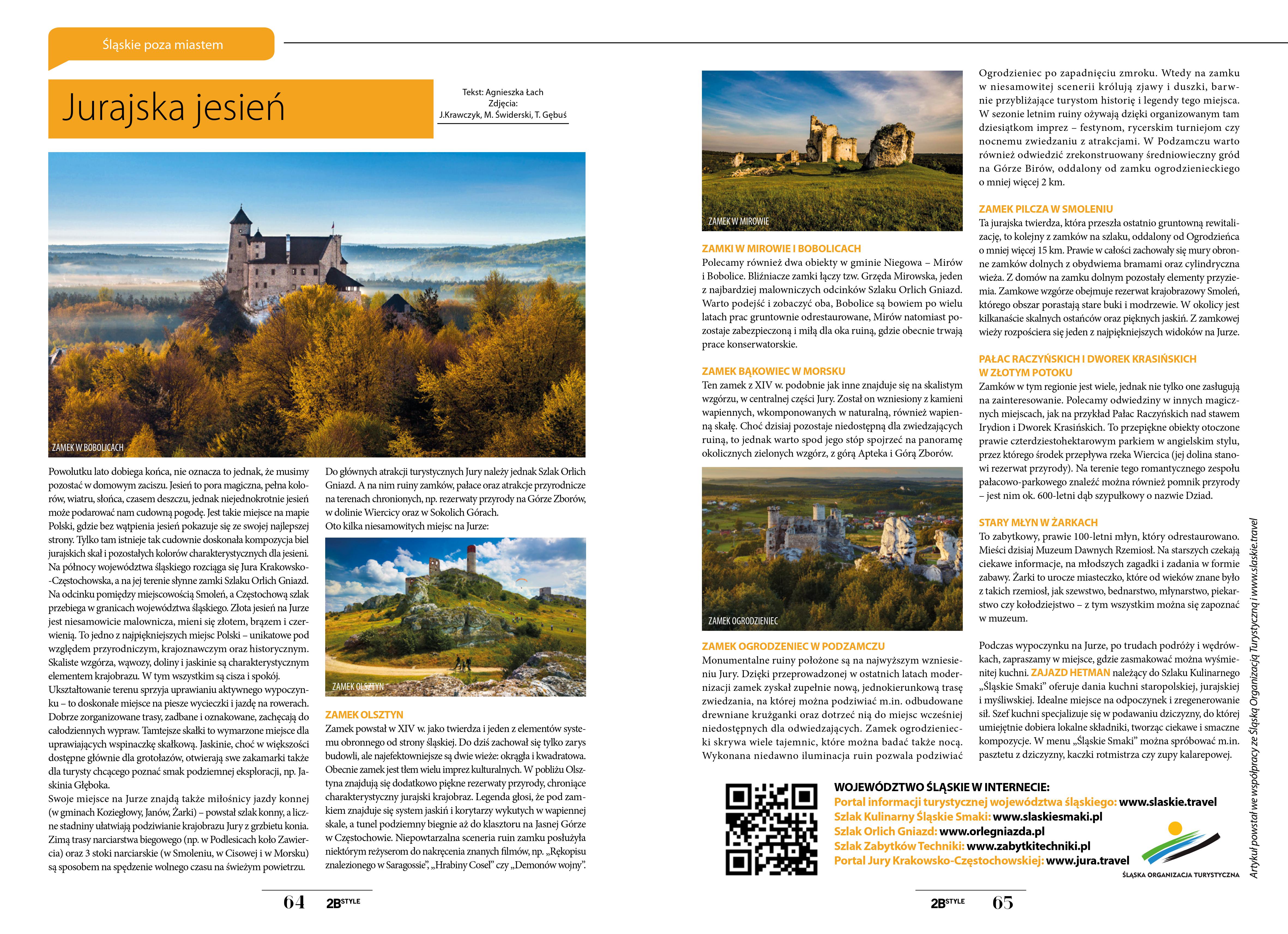Jest takie miejsce na mapie Polski, gdzie bez wątpienia jesień pokazuje się ze swojej najlepszej strony. Tylko tam istnieje tak cudownie doskonała kompozycja bieli jurajskich skał i pozostałych kolorów charakterystycznych dla jesieni. Na północy województwa śląskiego rozciąga się Jura Krakowsko-Częstochowska, a na jej terenie słynne zamki Szlaku Orlich Gniazd. Na odcinku pomiędzy miejscowością Smoleń, a Częstochową szlak przebiega w granicach województwa śląskiego. Złota jesień na Jurze jest niesamowicie malownicza, mieni się złotem, brązem i czerwienią. To jedno z najpiękniejszych miejsc Polski – unikatowe pod względem przyrodniczym, krajoznawczym oraz historycznym. Skaliste wzgórza, wąwozy, doliny i jaskinie są charakterystycznym elementem krajobrazu. W tym wszystkim są cisza i spokój.