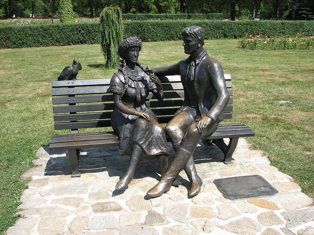Ławeczka Karolinki i Karlika w chorzowskim Rosarium, autor: Abraham – https://pl.wikipedia.org