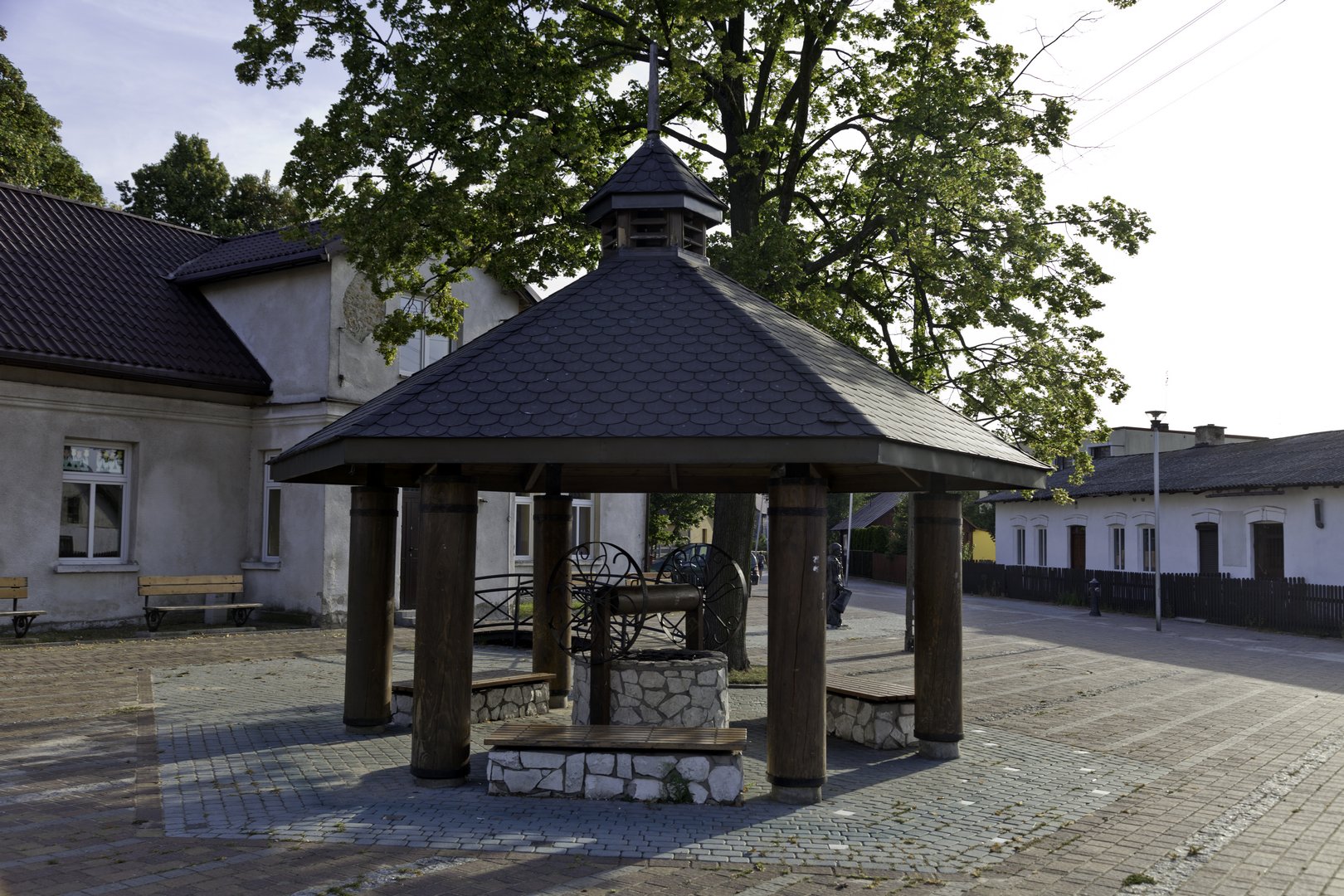 Dalej na południe widzimy zadaszoną studnię, której wnętrze ozdobiono herbami niegdysiejszych posiadaczy Złotego Potoku. W pobliżu stoi też budynek dawnej straży pożarnej, założonej przez hrabiego Raczyńskiego. Najciekawszy jest jednak wijący się od studni „niebieski potok”, nad którym przerzucono niewielki mostek. To, co prawda, pomalowana kostka granitowa, ale symbolicznie nawiązuje do nazwy miejscowości. W „potoku” zaś brodzi „nosiwódka”, czyli spiżowa figura niosącej wodę w wiadrach dziewczyny, u której stóp spostrzegawczy odnajdą wąsatego raka. Rzeźba jest dziełem znanego częstochowskiego artysty, Jerzego Kędziory.