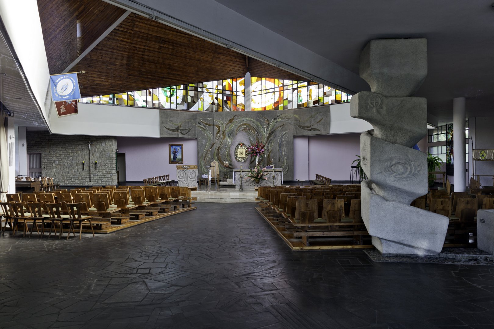 Projekt architektoniczny przygotował Stanisław Kwaśniewicz. Kościół wzniesiono na planie dwóch nakładających się na siebie czworoboków z wykorzystaniem najnowszych osiągnięć konstrukcyjnych i technologicznych (już lista użytych materiałów robi wrażenie: kamień, sztuczny marmur, szkło, aluminium, eternit, izolacja żużlowa i szklana, asfalt, plastibet, płytki terrakotowe, cegła, łom marmurowy na posadzkę, cegła szklana, ramy stalowe, drewno). Charakterystyczny dla drogomyskiego kościoła jest powtarzający się rytm trójkątów. Ciekawy efekt tworzą także mury procesyjne i niezwykła dzwonnica. Jasne, dzięki dużym przeszkleniom, wnętrze jest skupione na wyspie ołtarzowej. Twórcy ze Śląska i z Krakowa ozdobili je oryginalnymi ołtarzami, chrzcielnicą czy konfesjonałami. Witraże są projektu Marii i Jerzego Skąpskich, a wykonała je krakowska firma Ryniewicza.