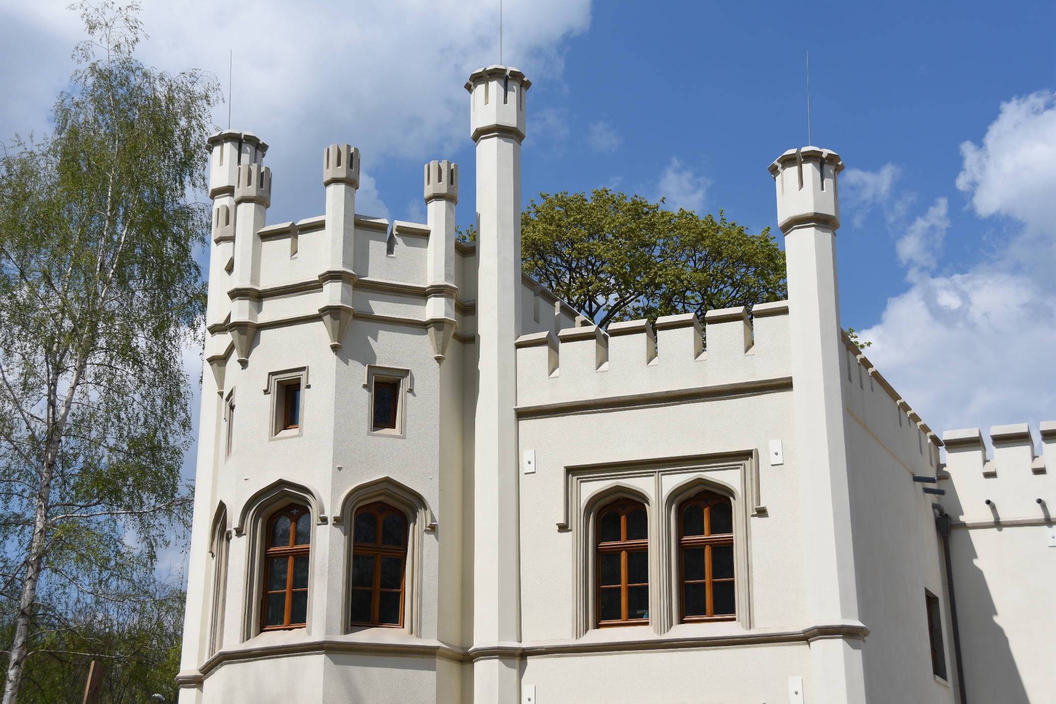 Hubert stał się inicjatorem rozbudowy pałacu w latach 1855-1859. Nowe założenie, w stylu będącym odmianą angielskiego neogotyku, zaprojektował architekt Richard Lucae, którego pierwotny projekt był jednak zmieniany podczas budowy. Do starego pałacu dodano dwa skrzydła boczne, urządzając w obrębie założenia m.in. galerię obrazów, bibliotekę, salę kwiatową oraz kaplicę zwaną chrzcielną, z witrażami i neogotyckim sklepieniem. Nad budowlą górowały Wieża Jaskółcza oraz, naśladująca architekturę zamków średniowiecznych, Wieża Prochowa. Na zachodnim krańcu założenia znalazła się Wieża Wodna (jedyna zachowana do dziś), która mieściła urządzenia wodociągowe.