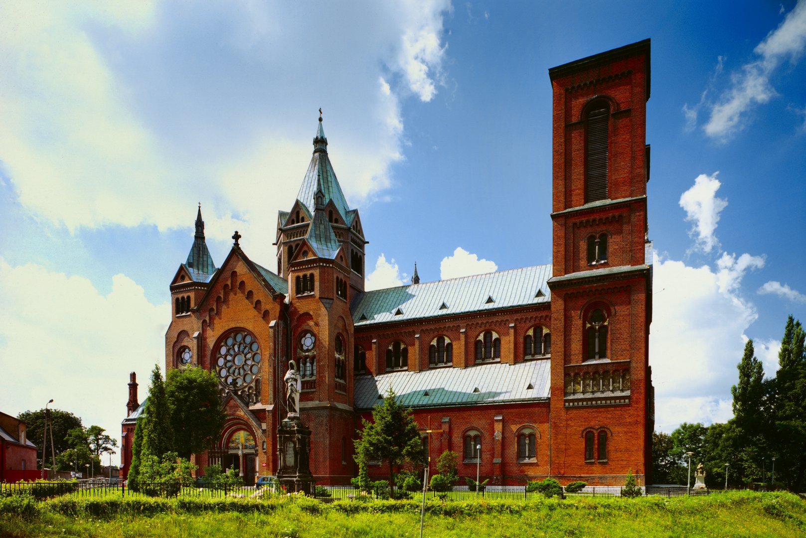 Kościół św. Stanisława wznoszono w latach 1904-1913. Powstał obiekt o imponujących rozmiarach: nawa główna ma 68 m długości i 24 szerokości. Kopuła nad transeptem sięga 51 m, wieże wymurowano do wysokości 39. Trójnawową bazylikę zbudowano z cegły, na planie krzyża łacińskiego. Od frontu znajdują się dwie wieże na planie kwadratu, wzrok przyciąga jednak ośmioboczna rotunda z kopułą nad przecięciem naw. Stylistycznie świątynia nawiązuje do sztuki romańskiej (charakterystyczne portale), choć nie brakuje elementów gotyckich, jak np. maswerki.