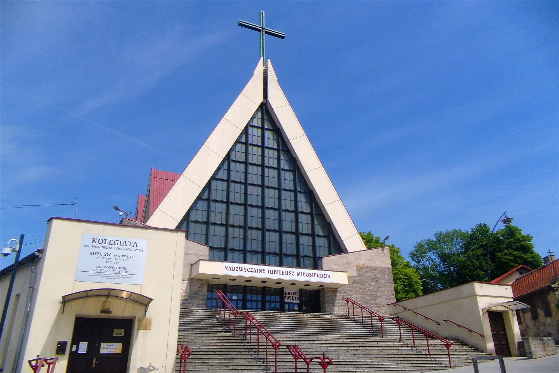 Parafia pod wezwaniem św. Wojciecha i św. Katarzyny Aleksandryjskiej w Jaworznie posiada ponad siedemsetletnią historię. Pierwszy, drewniany kościołek postawiono w tym miejscu w pierwszej połowie XIV wieku. W XVI postawiono kamienny kościół nadając drugie wezwanie św. Katarzyny. Rozbudowywany kościółek dotrwał do 2 połowy XX w. ustępując miejsca dzisiejszej świątyni. Dolny kościół konsekrował w roku 1978 ks. kardynał Karol Wojtyła. W 1997 świątynię podniesiono do rangi kolegiaty.