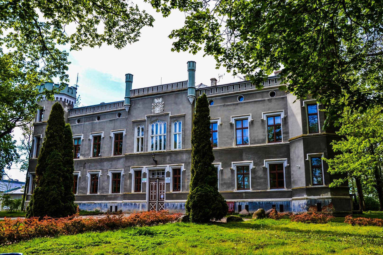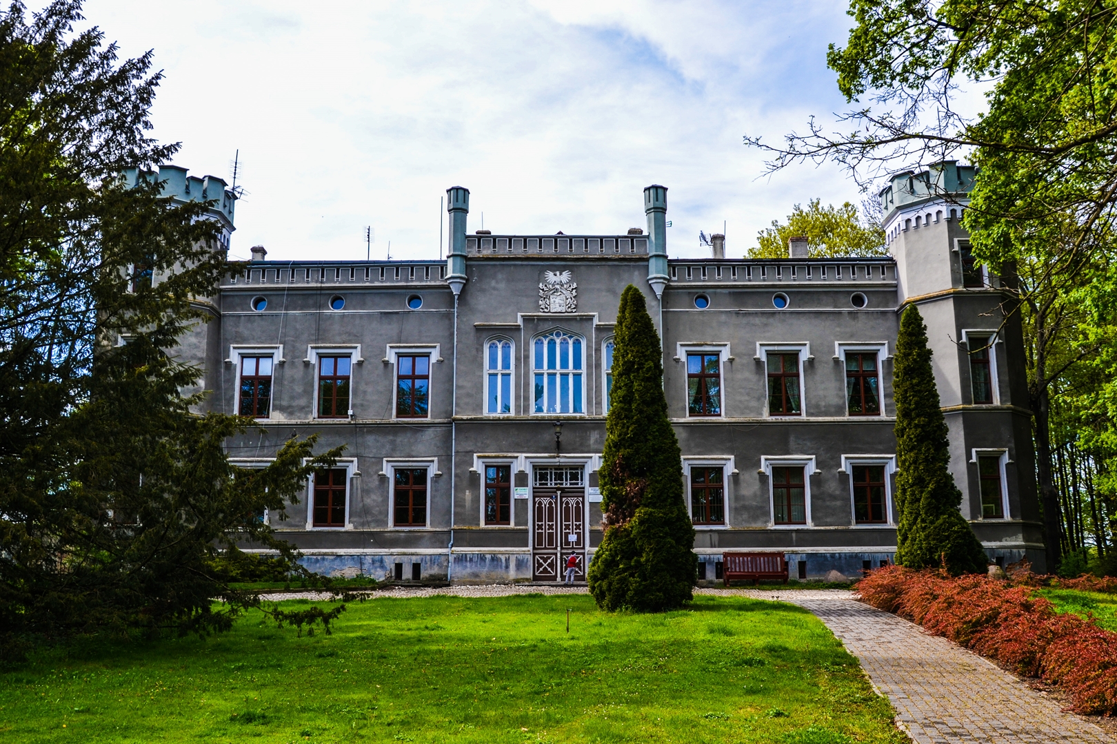 W holu sklepienia bogato zdobione elementami roślinnymi. Częściowo zachowany wystrój dawnych wnętrz. Obiekt użytkowany obecnie przez Stację Hodowli Roślin, otoczony parkiem krajobrazowym z aleją grabową i egzotycznymi okazami drzew. W parku ruina późnoklasycystycznego mauzoleum z poł. XIX w. a także kapliczka neogotycka z 1890 r., w której okno wbudowano, datowany na 1300 r., kamienny maswerk pochodzący z okna starego kościoła. Ponadto płyta nagrobna Victora von König (1854-1909).