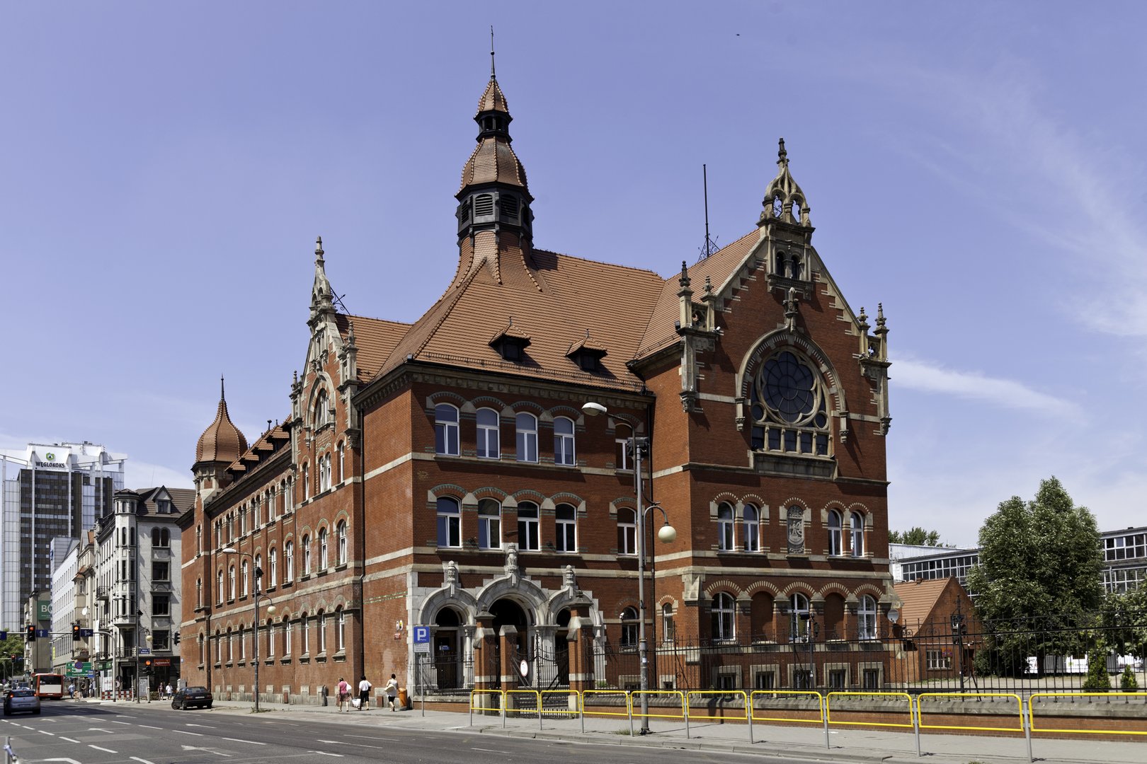 Jego projekt przygotował doświadczony budowniczy Józef Perzik. Szkoła została wzniesiona w latach 1898-1900 na placu przy ówczesnej August-Schneiderstrasse (obecnie ul. Mickiewicza). Jako budulca użyto czerwonej cegły, zaś detale architektoniczne wykonano z kamienia. Neogotycki wygląd gmachu współgrał z sąsiednimi obiektami: olbrzymią synagogą (została zniszczona przez hitlerowców podczas drugiej wojny) oraz łaźnią miejską. Budynek najładniej prezentuje się od strony wschodniej: wzrok przykuwa wieża zwieńczona kopułą, wejście główne oraz ryzalit z efektowną rozetą. W 1922 roku gimnazjum przejęły władze polskie - mimo to do początku lat 30. funkcjonowały w niej klasy z językiem wykładowym niemieckim. Po II wojnie światowej szkoła otrzymała imię Adama Mickiewicza. Uczniami katowickiego gimnazjum i liceum, w czasach i niemieckich, i polskich, było wiele znanych później osób. Kształcili się w niej m.in. Wojciech Korfanty i Konstanty Wolny – politycy polscy - czy Henryk Bednorz, Ignacy Jeż, Czesław Domin i Wilhelm Pluta – katoliccy biskupi.