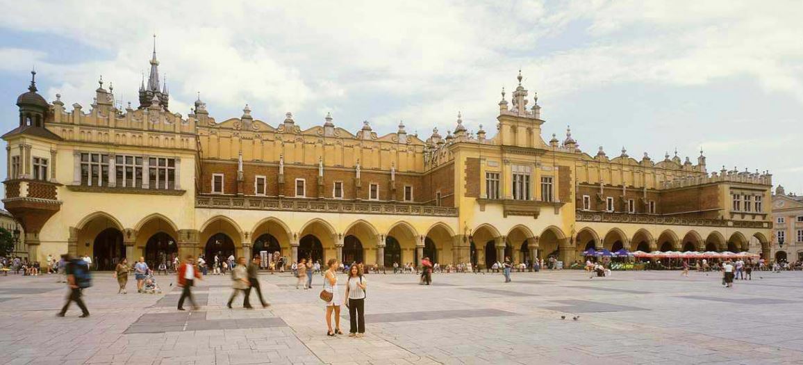 Sukiennice powstały w XIII wieku, i wówczas były tylko dwuszeregiem kramów należących do handlarzy suknem. W czasach Kazimierza Wielkiego wzniesiona została gotycka hala o długości 108 metrów, która uległa zniszczeniu podczas pożaru w 1555 r. Sukiennice zostały odbudowane jako okazły gmach, zwieńczony renesansową attyką ozdobioną maszkaronami. W XIX wieku zostały przebudowane, dodano neogotyckie arkadowe podcienia. Wewnątrz, jak przed wiekami, kwitnie handel, a na ścianach widnieją godła kupieckie i cechowe oraz herby miast polskich.