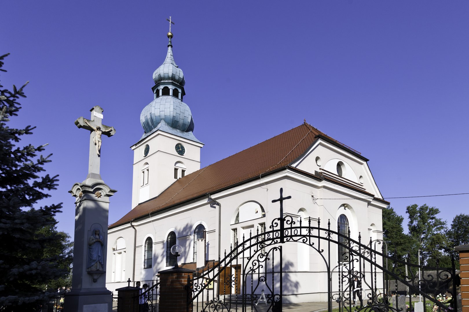 Kościół Wniebowzięcia NMP wzniesiono na planie prostokąta i przykryto dachem dwuspadowym, obłożonym dachówką. Stylistycznie nawiązano do klasycyzmu. Wieżę, wysuniętą nieznacznie przed lico elewacji frontowej, wymurowano dopiero w latach 1923-24. Nałożono na nią baniasty hełm z latarnią przykrytą mniejszym hełmem. Wnętrze jest jednonawowe. Przechowuje się tu m.in. relikwie bł. Jana Pawła II oraz XVIII-wieczny krucyfiks. Na cmentarzu przykościelnym pochowano 18 ofiar tzw. marszu śmierci, czyli ewakuacji więźniów z obozu oświęcimskiego zimą 1945 roku. Po północnej stronie kościoła przetrwały do naszych czasów dwa kamienne krzyże pokutne.