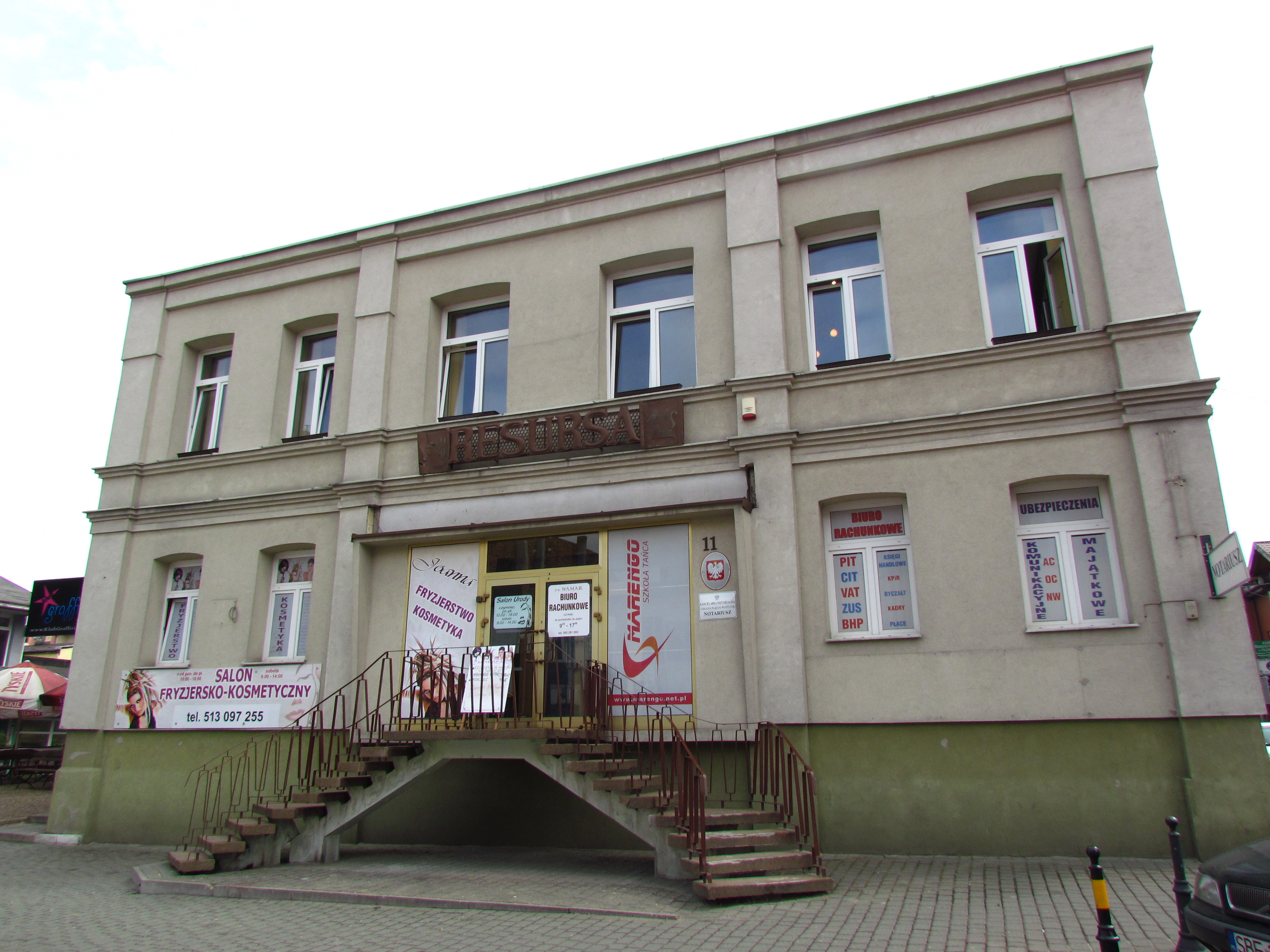 Dwukondygnacyjny budynek Resursy wzniesiono z cegły (otynkowali go dopiero Niemcy podczas II wojny światowej). Stylistycznie nawiązywał do renesansu. Przed wejściem znajdował się ganek podparty filarami, można było zobaczyć schodkowy szczyt i namiastkę attyki. Wewnątrz najważniejsza była największa w okolicy sala balowa.