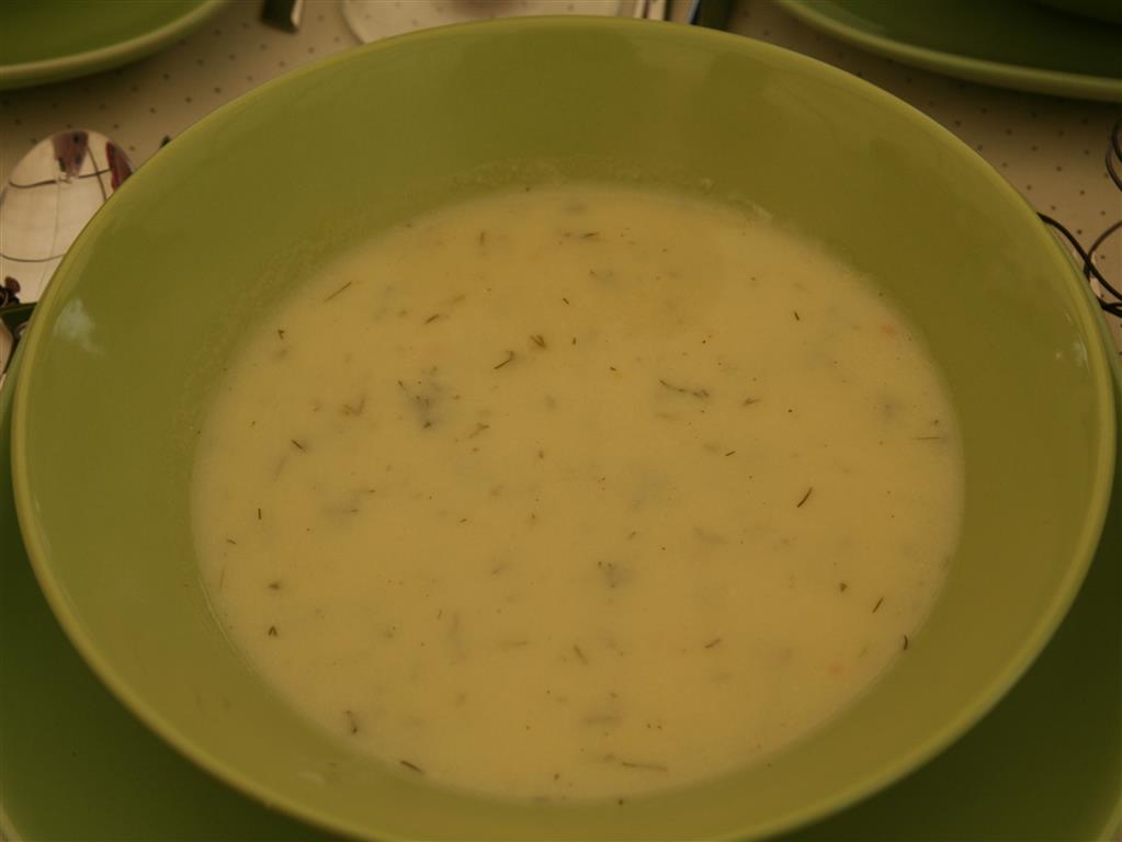 Zagotować kość wołową, następnie dodać śmietanę, rozmąconą z jajkami i mąką. Doprawić do smaku i posypać posiekanym koperkiem.