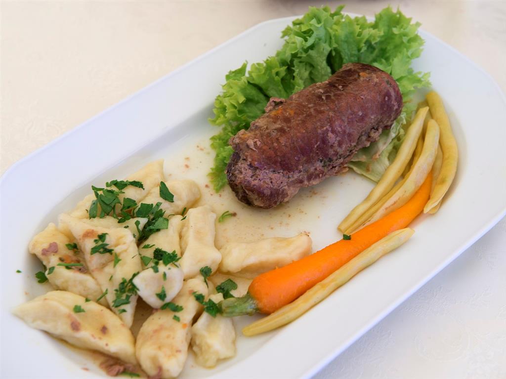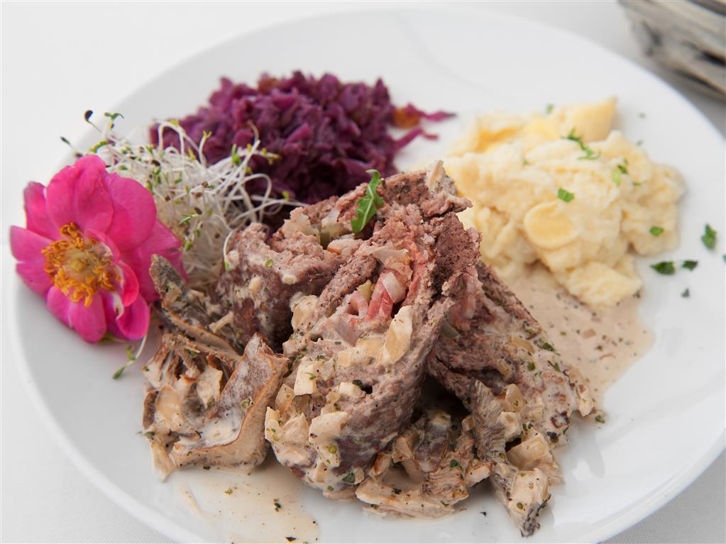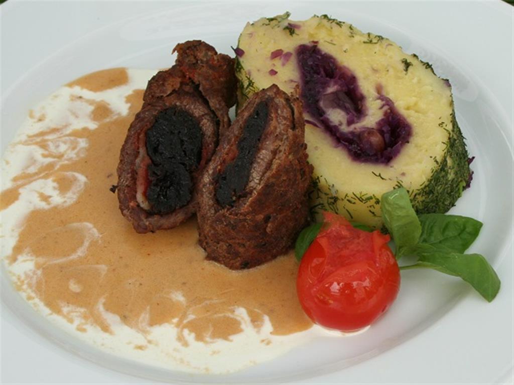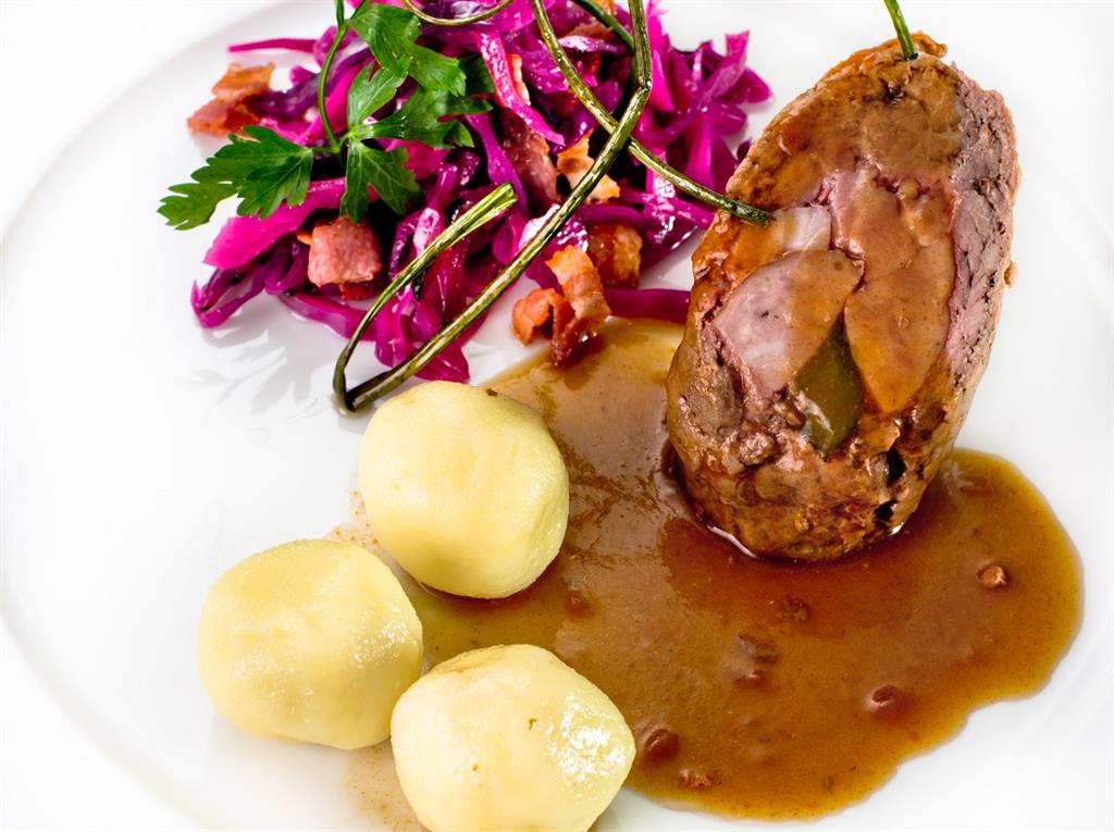 Mięso pokroić w plastry, rozbić, przyprawić solą i pieprzem, posmarować musztardą. Na mięsie rozłożyć równomiernie ogórki pokrojone w paski i boczek wędzony oraz pokrojoną w cząstki cebulę. Plastry mięsa zwinąć, uformować rolady, obwiązać białą nitką, oprószyć mąką i smażyć na rozgrzanym smalcu na patelni ze wszystkich stron. Przełożyć do rondla, podlać tłuszczem ze smażenia i ciepłą wodą, dodać listek laurowy i ziele angielskie, dusić do miękkości. W czasie duszenia rolady obracać i podlewać, a gdy mięso będzie miękkie, wyjąć i sporządzić sos.