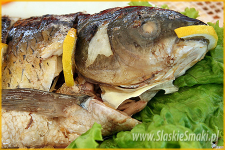 Karpia podzielić na dzwonki, natrzeć solą i pozostawić na godzinę w chłodnym miejscu. W naczyniu ugotować wywar z warzyw, lekko posolić do smaku i włożyć do wrzątku karpia. Wywar można lekko skropić sokiem z cytryny. Gotować do miękkości na bardzo małym ogniu. Ostrożnie wyjąć, ułożyć na półmisku, udekorować warzywami pokrojonymi w talarki, plasterkami cytryny i zieleniną. Gorącą potrawę polać lekko zrumienionym masłem.