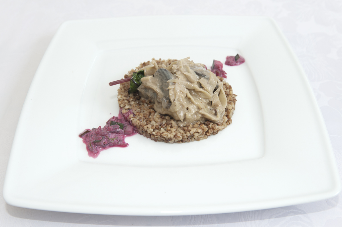 Wątróbki obsmażamy, dodajemy cebulę, masło, jabłko i chwilę dusimy. Podlewamy śmietanką. Kaszę obsmażamy z cebulką i podlewamy bulionem. Buraczki i ogórki kroimy, dodajemy jogurt naturalny i doprawiamy koperkiem, octem, solą i pieprzem. Podajemy z blanszowaną botwinką.