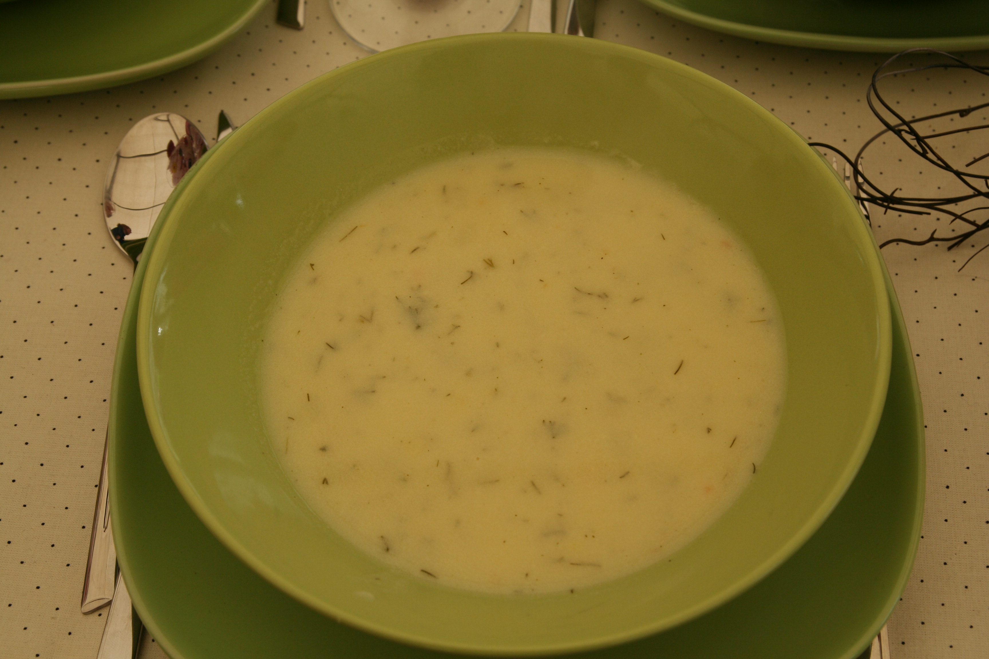 Zagotować kość wołową, następnie dodać śmietanę, rozmąconą z jajkami i mąką. Doprawić do smaku i posypać posiekanym koperkiem.