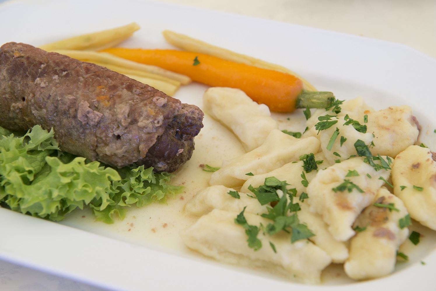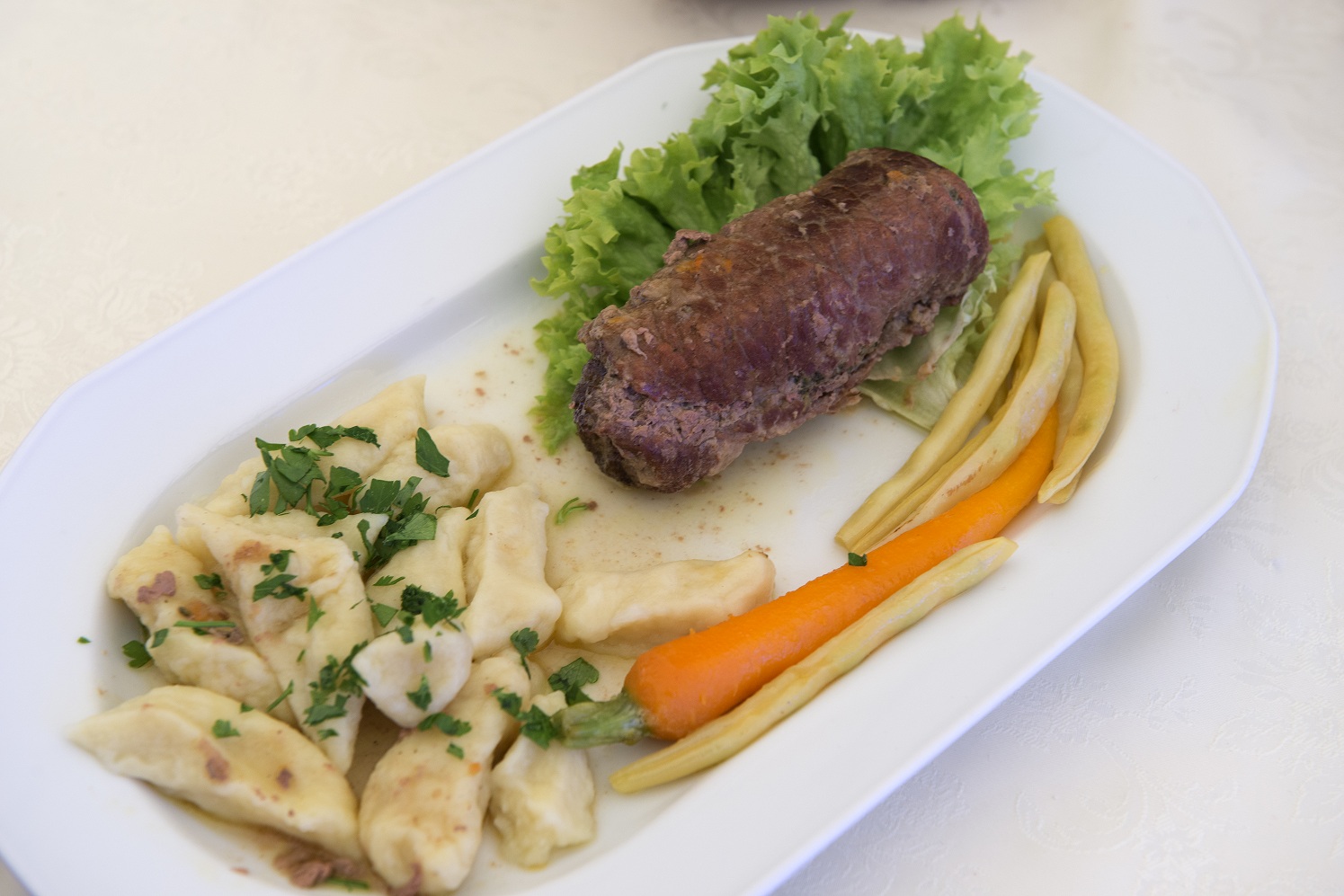 Ziemniaki ugotować w osolonej wodzie, odcedzić i przestudzić. Ciepłe przecisnąć przez praskę na wysypaną mąką stolnicę. Dodać oba rodzaje mąki, jajka i razem szybko wyrobić. Formować wałki i skośne kroić w równe kawałki. Gotować w osolonej wodzie. Szpinak ugotować w osolonej wodzie, dobrze odcisnąć, drobno posiekać i usmażyć na dwóch łyżkach masła. Dodać rozgnieciony czosnek, jajka i namoczoną odciśniętą bułkę, dobrze wymieszać i doprawić do smaku solą i pieprzem. Wołowinę pokroić w plastry, dobrze rozbić, oprószyć przyprawami i mąką. Masę szpinakową rozsmarować na mięsie. Zwinąć rolady, dosmażyć na tłuszczu i dusić w bulionie do miękkości.