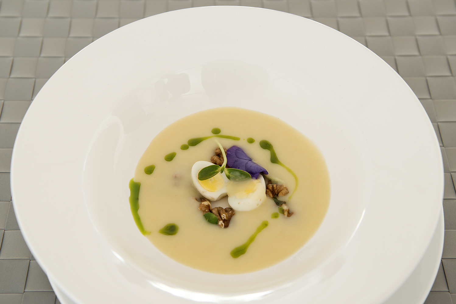 Krem z chrzanu z prażonymi orzechami, jajkiem przepiórczym i oliwą koperkową