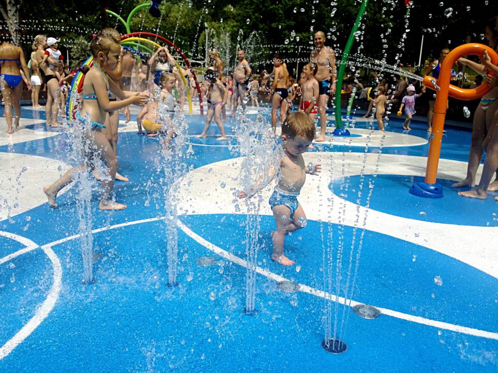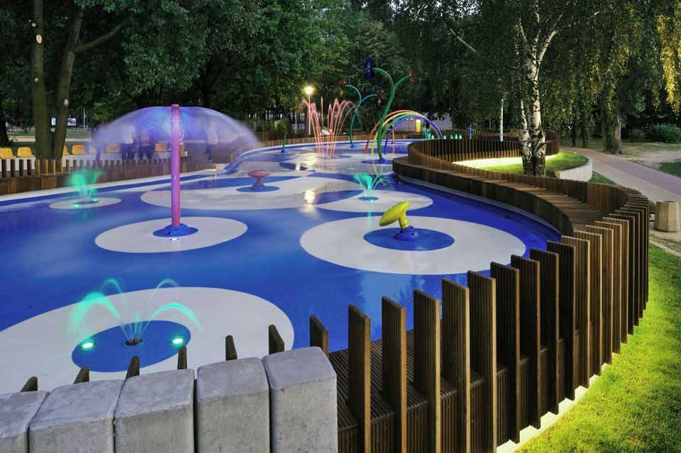 Wodny plac zabaw znajduje się pomiędzy drzewami, gdzie wygospodarowano sporą ogrodzoną przestrzeń, w której umieszczono wiele wodnych atrakcji. Mieszczą się tu liczne fontanny w formie kwiatów, tęczowa wodna brama, zawieszone wysoko wiadra przelewowe, armatki wodne i wiele innych. Te atrakcje stworzone są z myślą o starszych dzieciach, ale nie zapomniano także o maluszkach. Specjalnie dla niech wydzielone są strefy z wodnymi zabawkami, gdzie woda w fontannach ma dużo mniejsze ciśnienie. Warto wspomnieć o miękkim, antypoślizgowym podłożu, na które naniesiono ciekawe wzory mające przypominać wodne kręgi. Wszystko jest tu kolorowe i zachęca do świetnej zabawy.