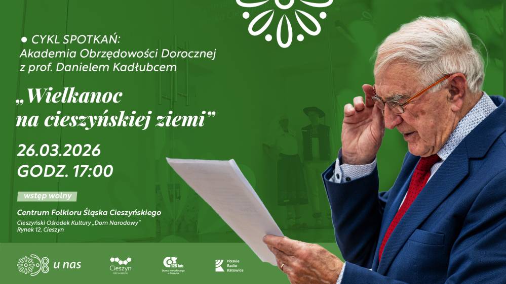 Cieszyński Ośrodek Kultury "Dom Narodowy" zaprasza na spotkanie z wybitnym znawcą kultury, tradycji i języka Śląska Cieszyńskiego, profesorem Danielem Kadłubcem. W czwartek 26 marca 2026 r. o godzinie 17:00 w Centrum Folkloru Śląska Cieszyńskiego, na drugim piętrze Domu Narodowego w Cieszynie odbędzie się spotkanie pt. "Wielkanoc na cieszyńskiej ziemi", podczas którego odkrywać będziemy wspólnie kolejny wycinek bogactwa tradycji Śląska Cieszyńskiego, związany z obchodami Wielkanocy. Serdecznie zapraszamy!
