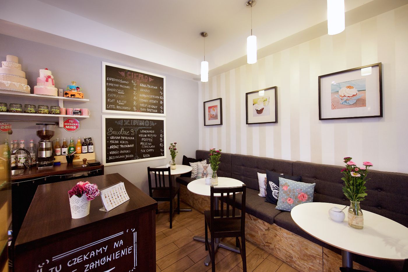 Miss Cupcake pachnie kawą i herbatą, ale przede wszystkim pachnie wypiekami. Każdego dnia wypiekane są inne smaki babeczek, inne ciasta i sezonowe desery. Jesienią prym wiedzie tarta pekanowa i sernik dyniowy, latem wypieki pełne truskawek i malin. Grudzień ma tutaj zapach babeczek piernikowych, maj – rabarbarowych.